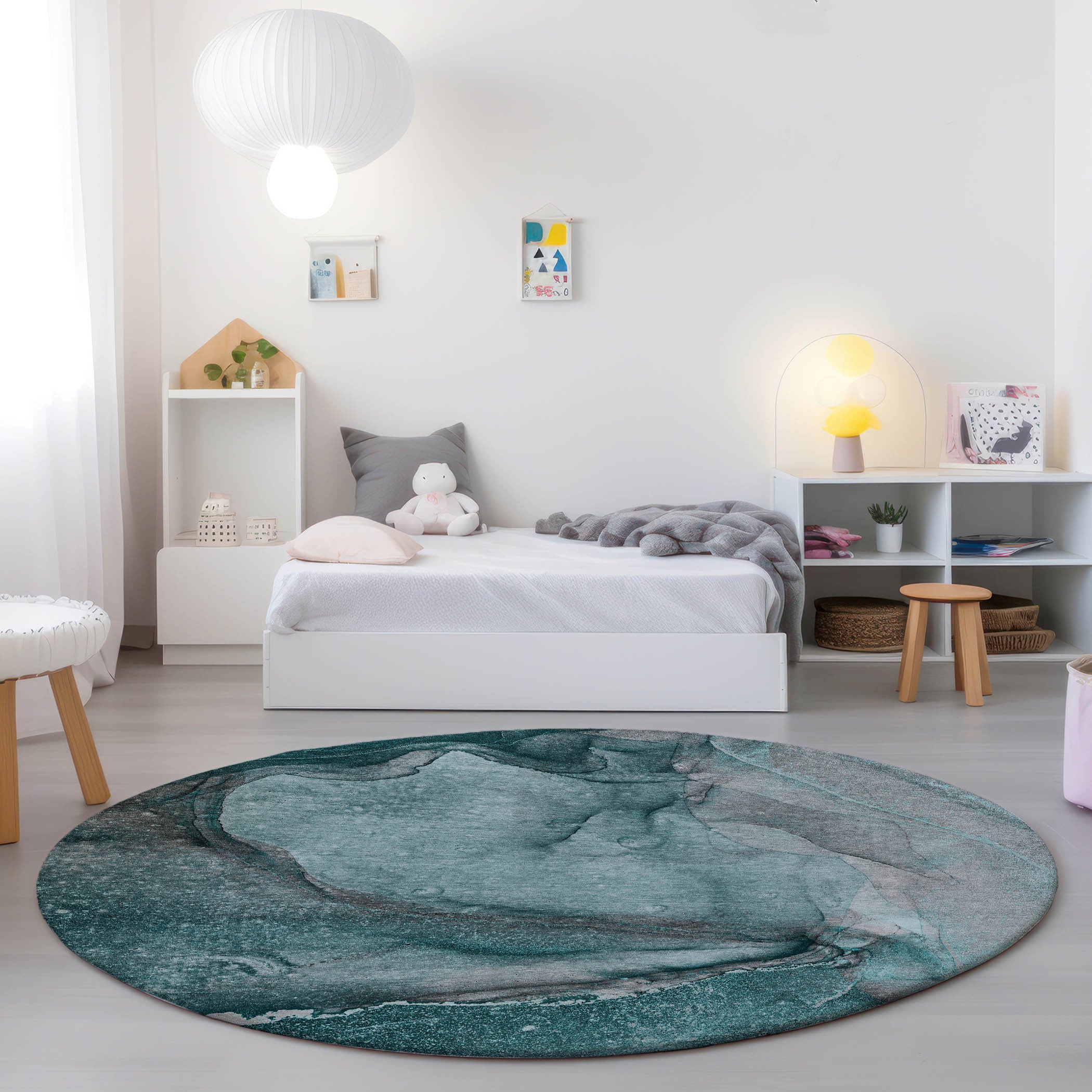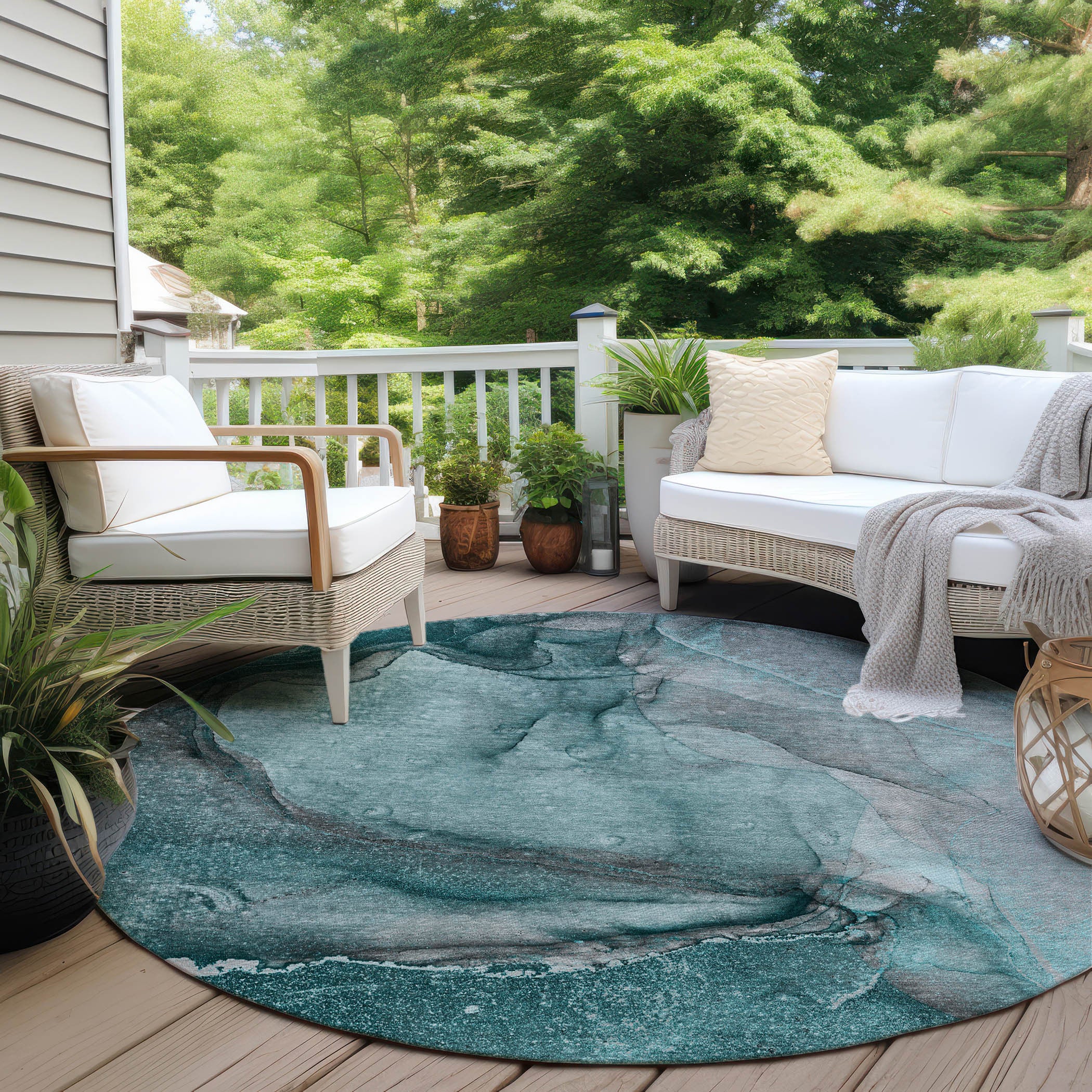 8' Round Teal Round Abstract Washable Non Skid Indoor Outdoor Area Rug