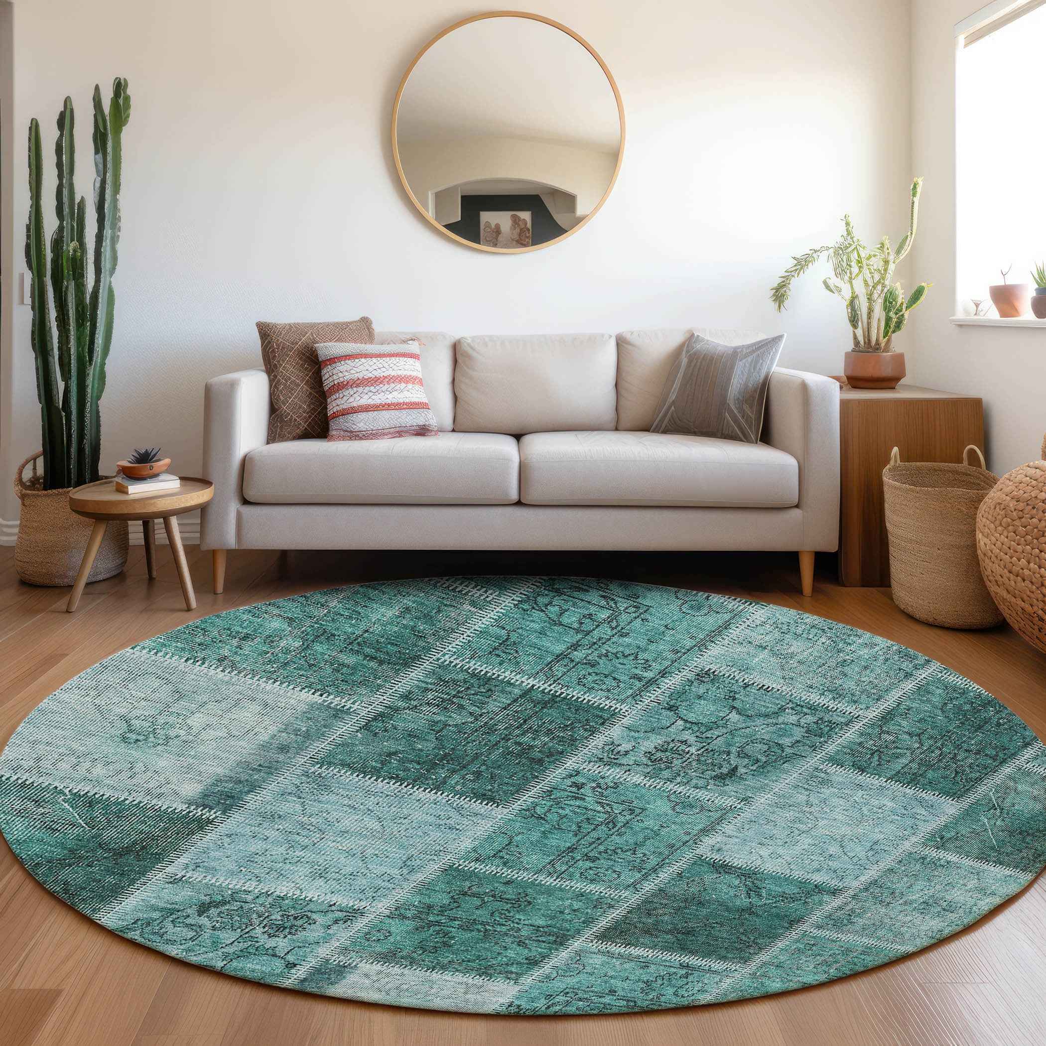 8' Teal Blue Aqua And Charcoal Round Patchwork Washable Indoor Outdoor Area Rug