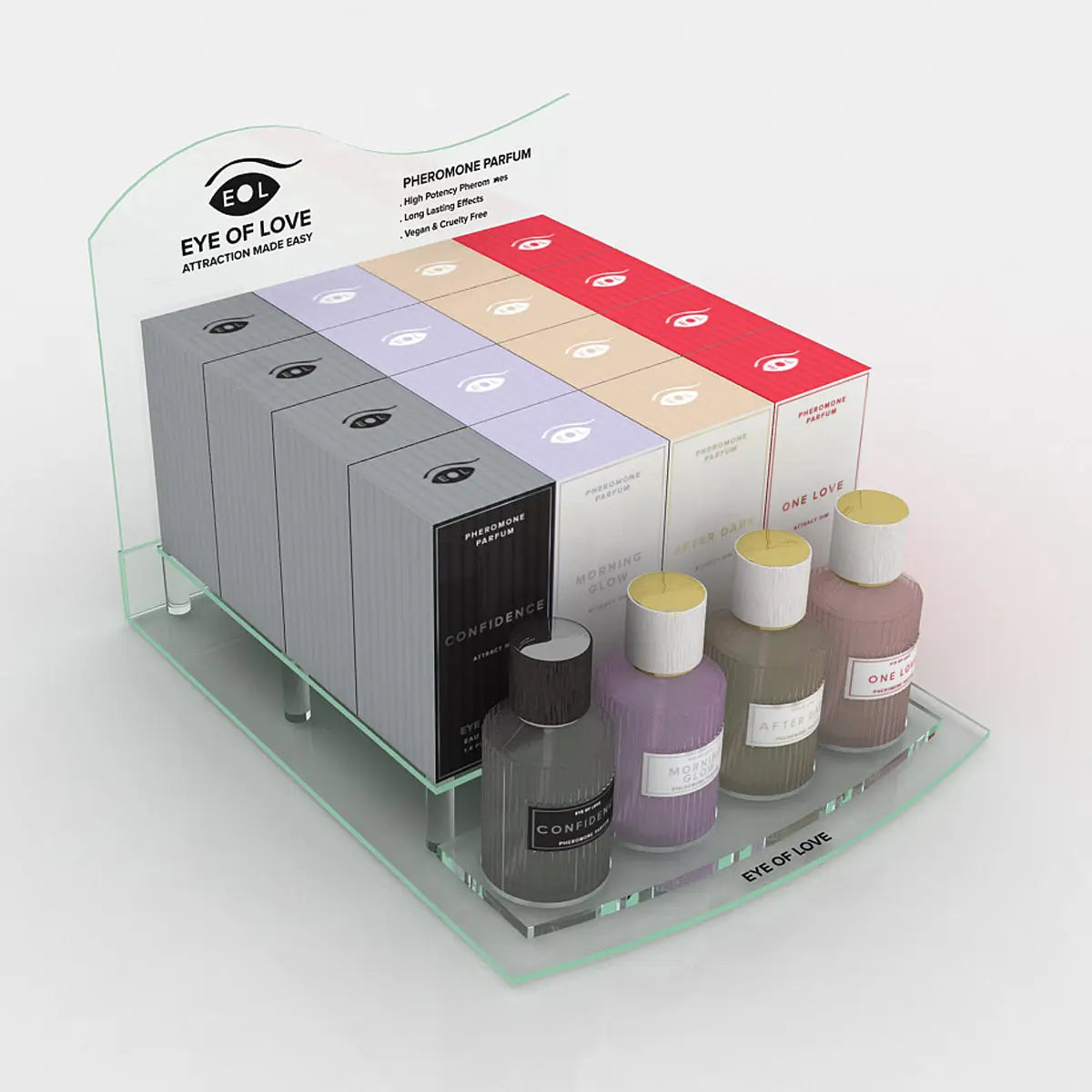 Elevate your allure with Confidence to Attract Her, and Morning Glow, After Dark, and One Love to Attract Him. This modern display includes six of each fragrance, along with testers for an immersive experience. Unleash the power of attraction with this sophisticated collection designed to enhance confidence and spark connection.