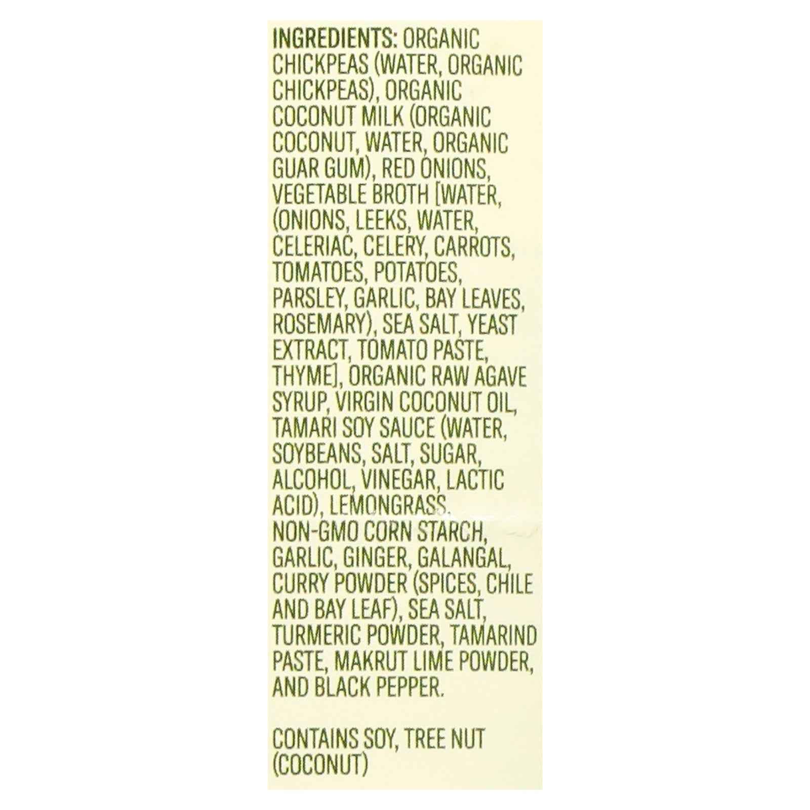 ingredients : organic chickpeas (water, organic chickpeas);organic coconut milk (organic coconut, water, organic guar gum);red onions;vegetable broth [water, (onions, leeks, water, celeriac, celery, carrots, tomatoes, potatoes, parsley, garlic, bay leaves, rosemary), sea salt, yeast extract, tomato paste, thyme];organic raw agave syrup;virgin coconut oil;tamari soy sauce (water, soybeans, salt, sugar, alcohol, vinegar, lactic acid);lemongrass;non-gmo corn starch;garlic;ginger;galangal;curry powder (spices, ch