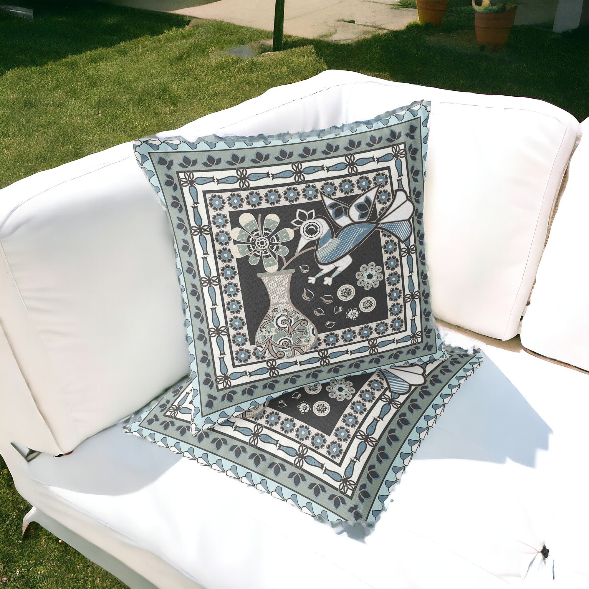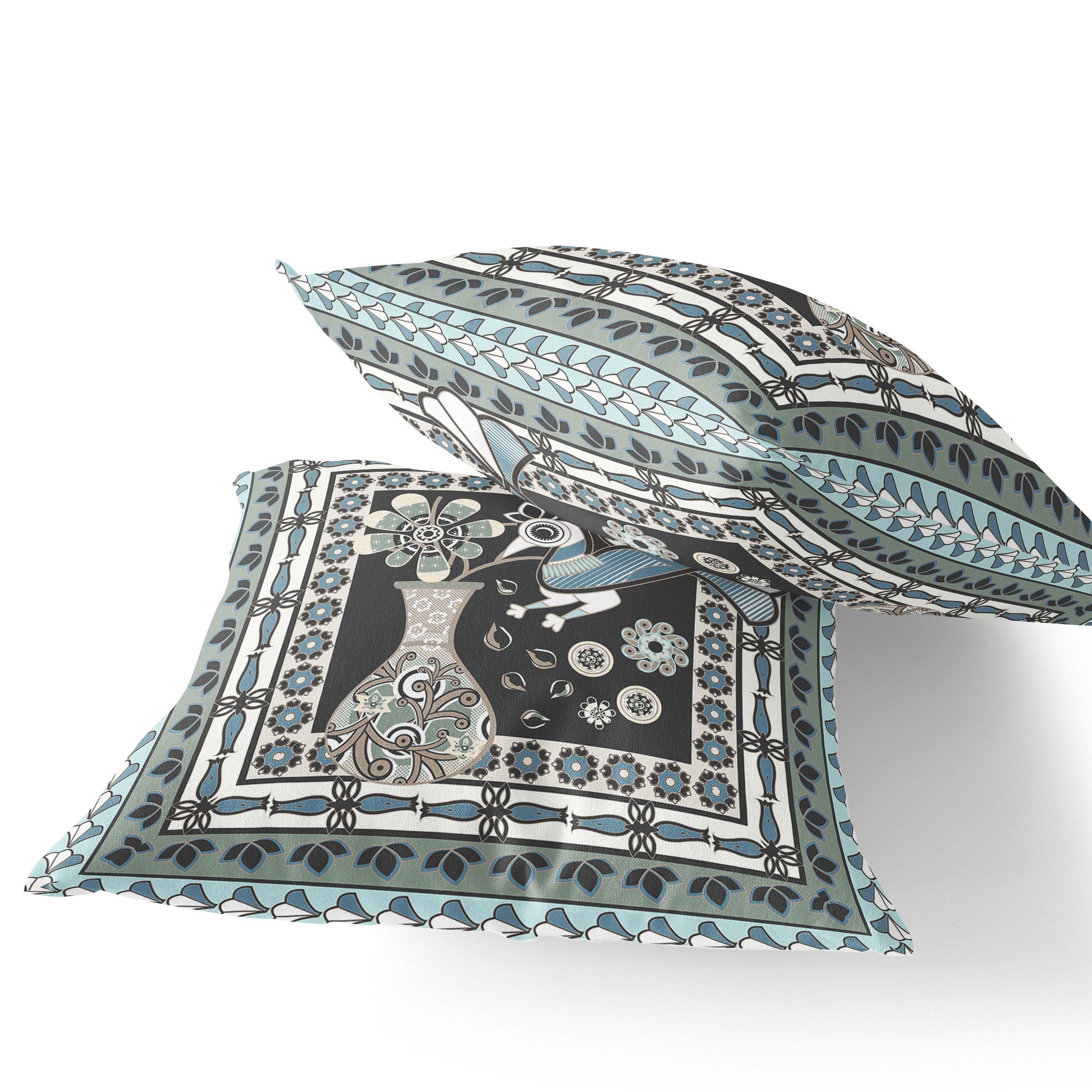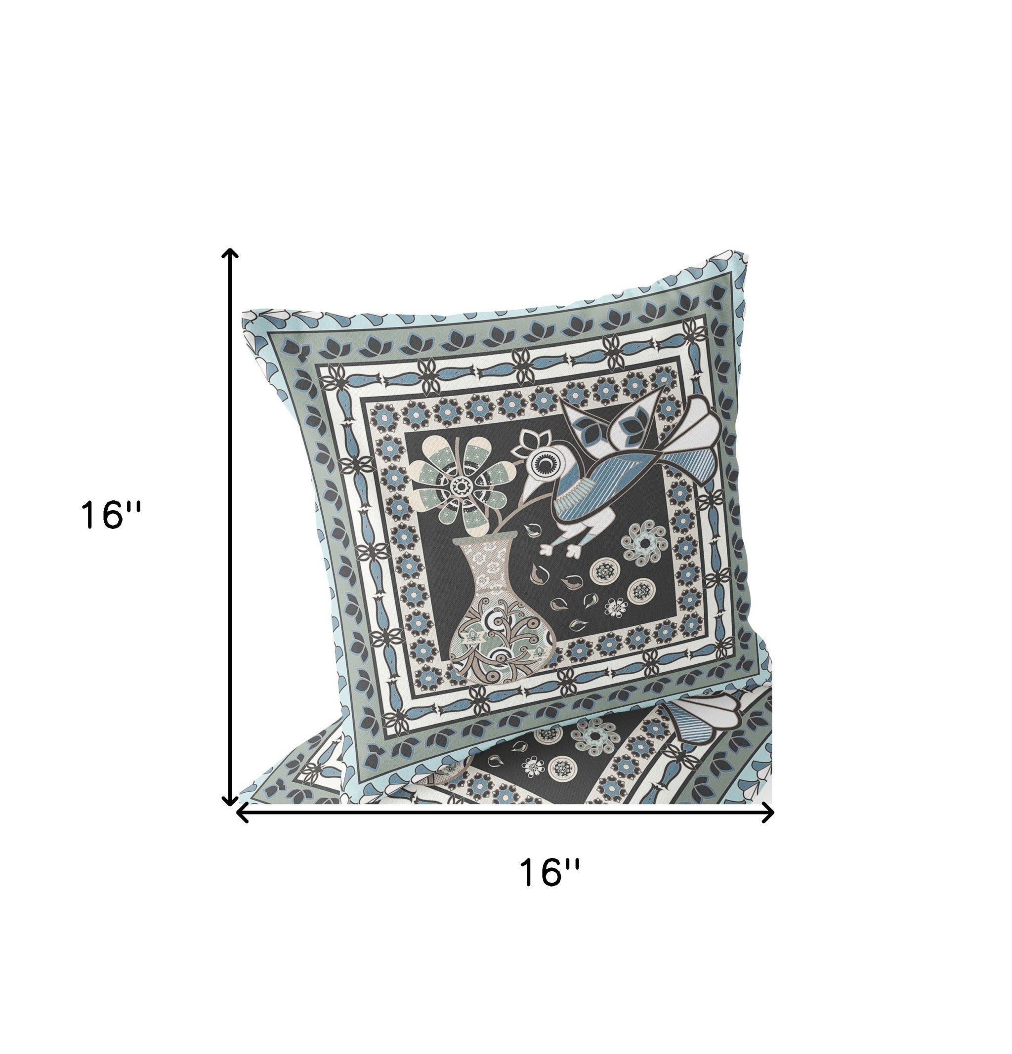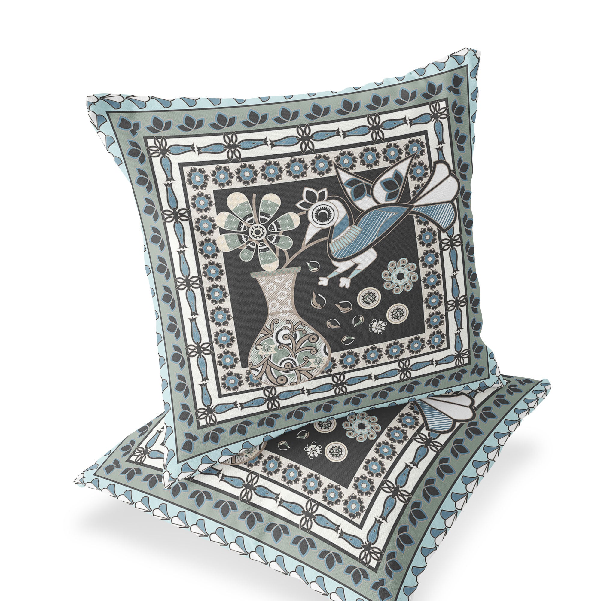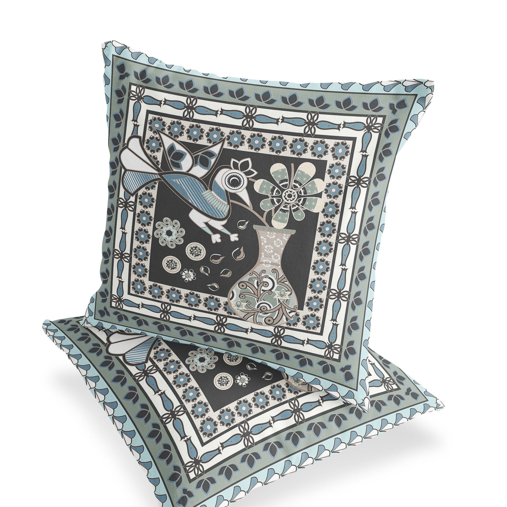 Set of Two 16" X 16" Black and Blue Peacock Blown Seam Floral Indoor Outdoor Throw Pillow