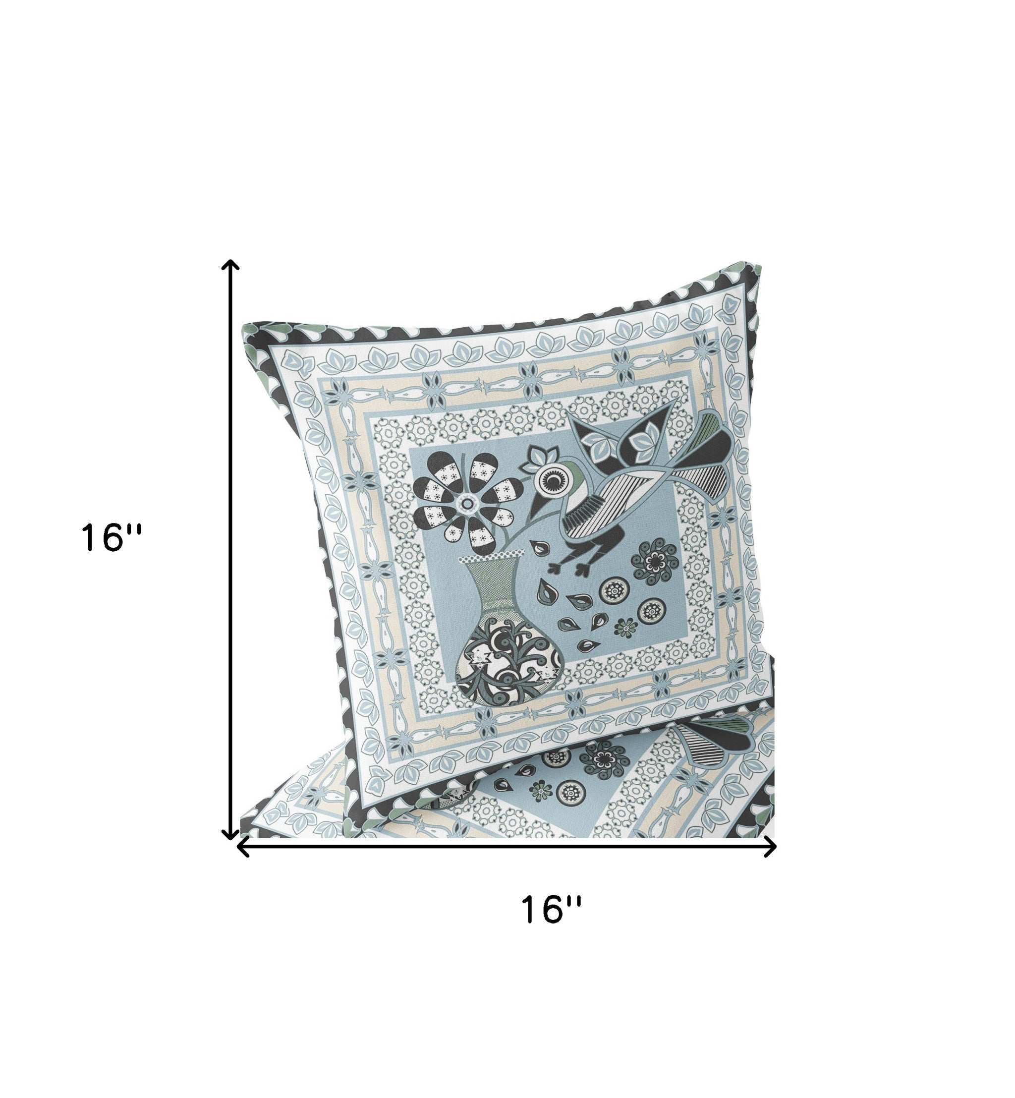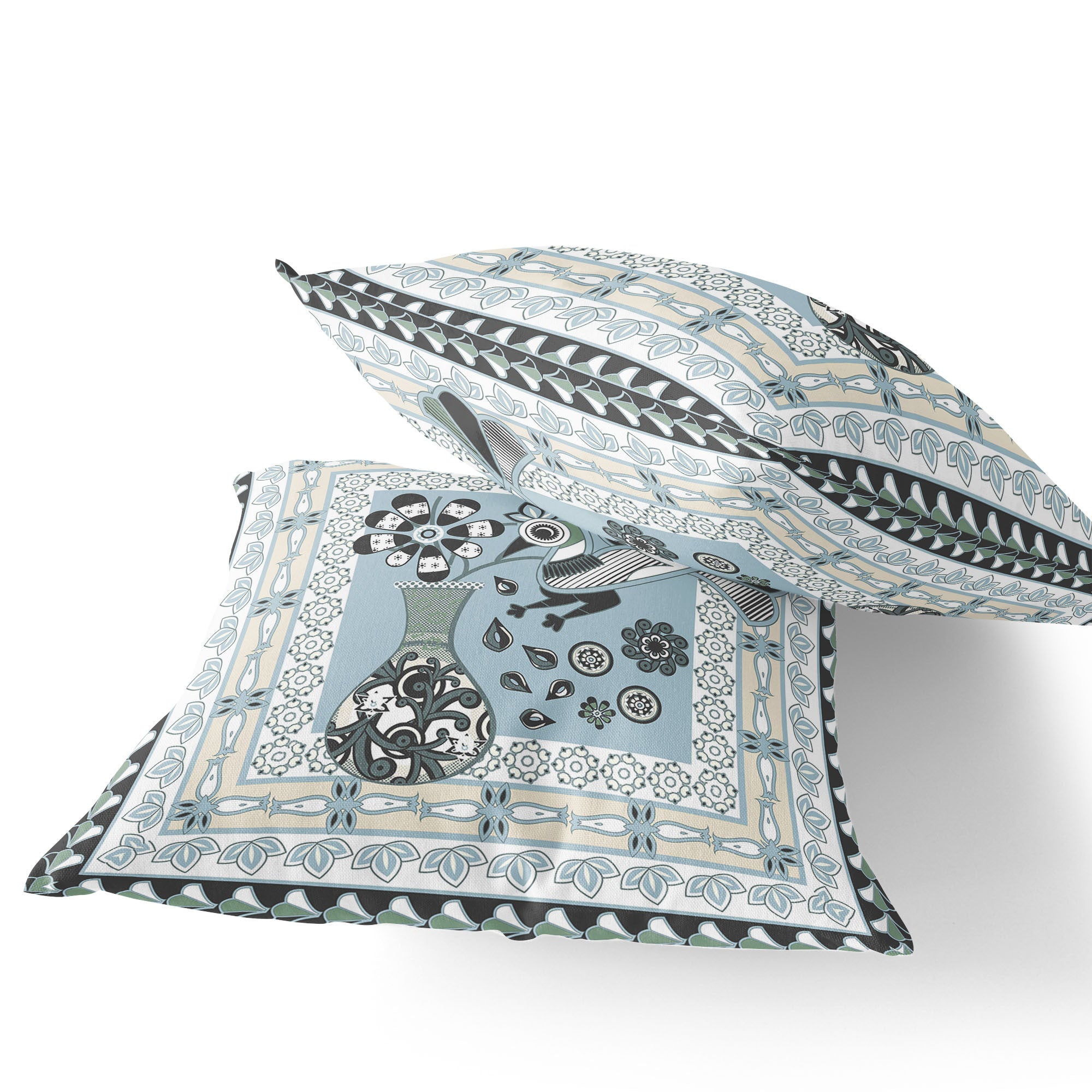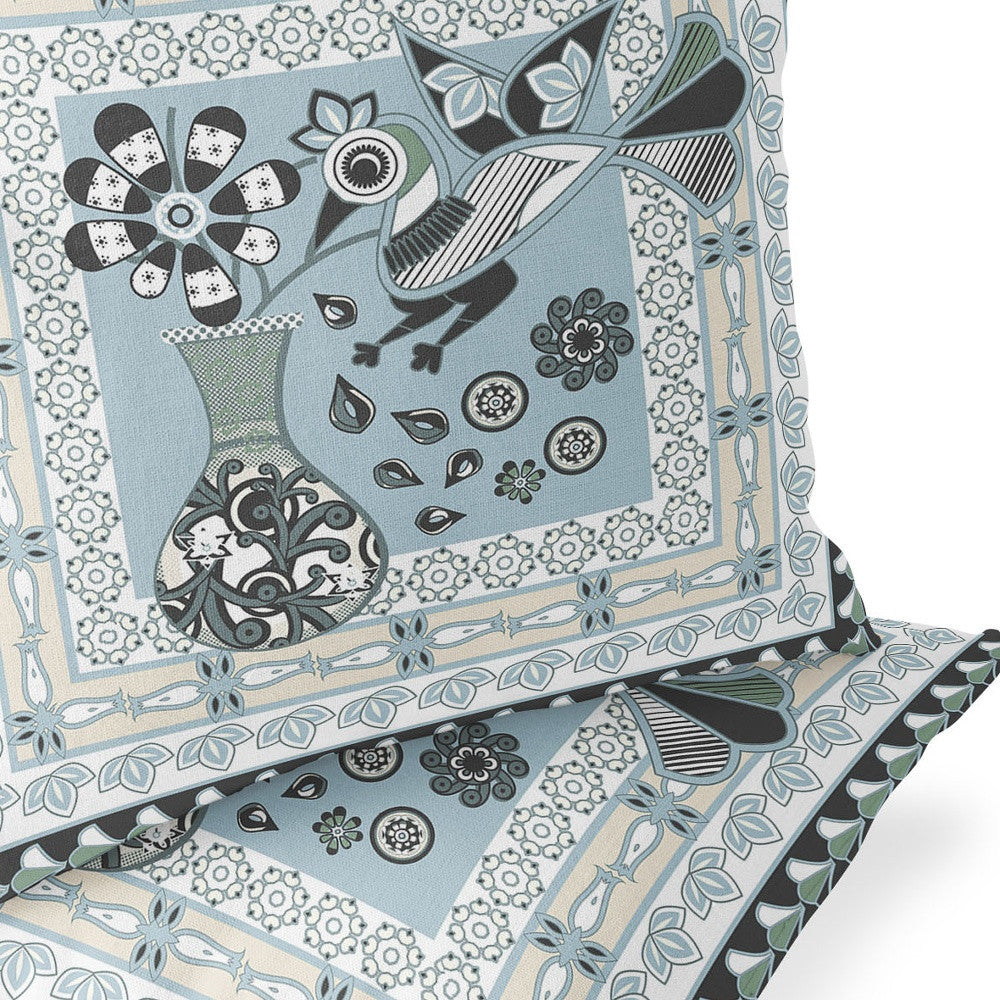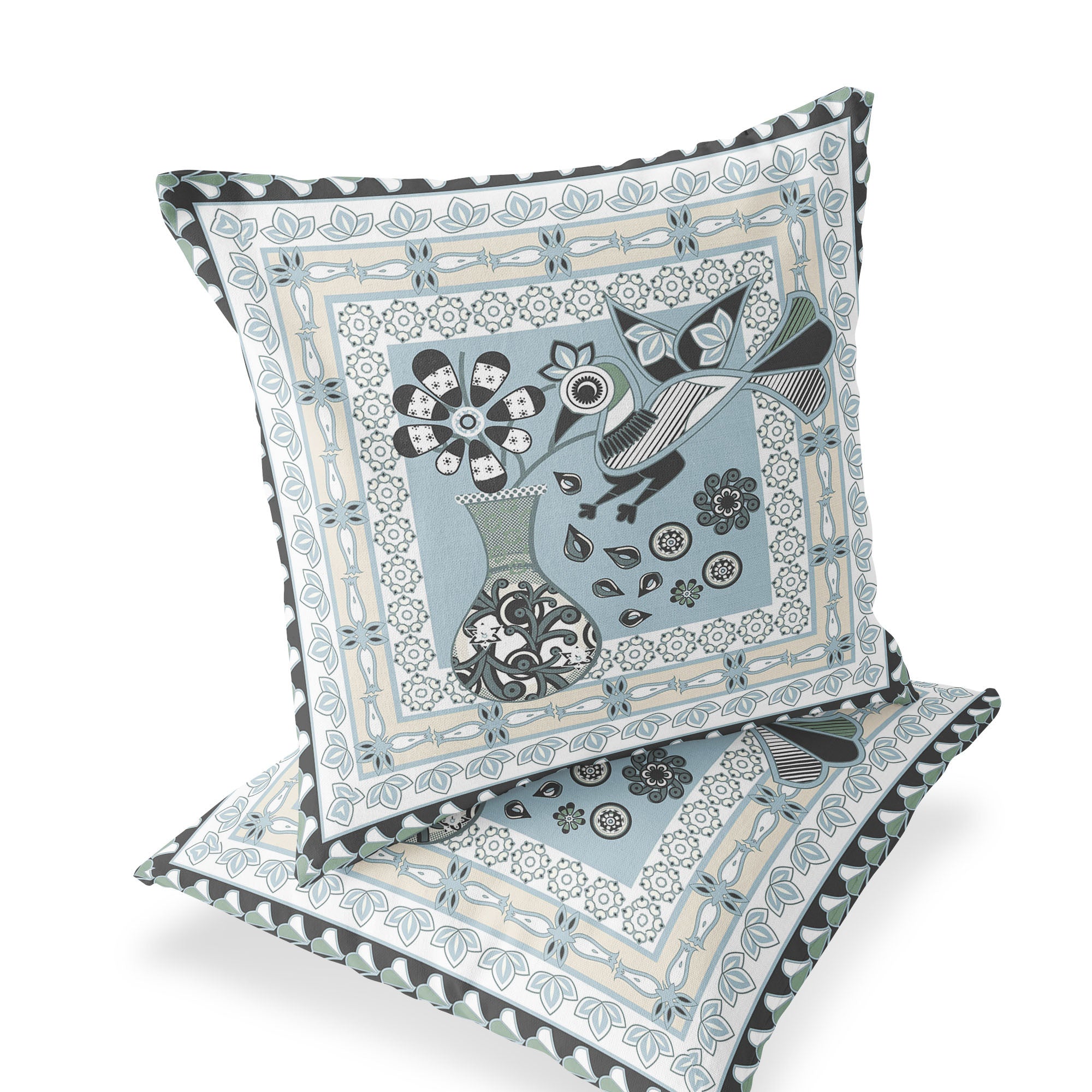 Set of Two 16" X 16" Blue and Black Peacock Blown Seam Floral Indoor Outdoor Throw Pillow