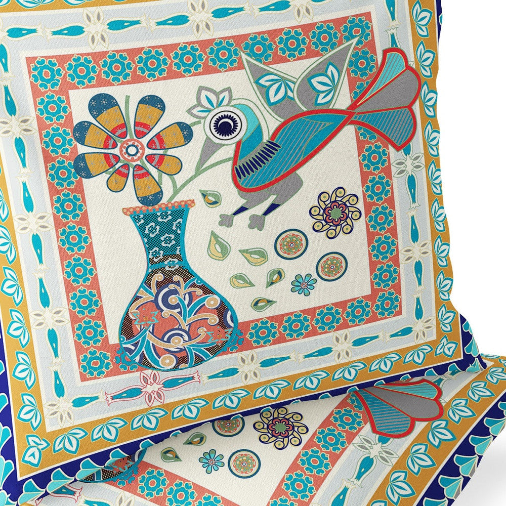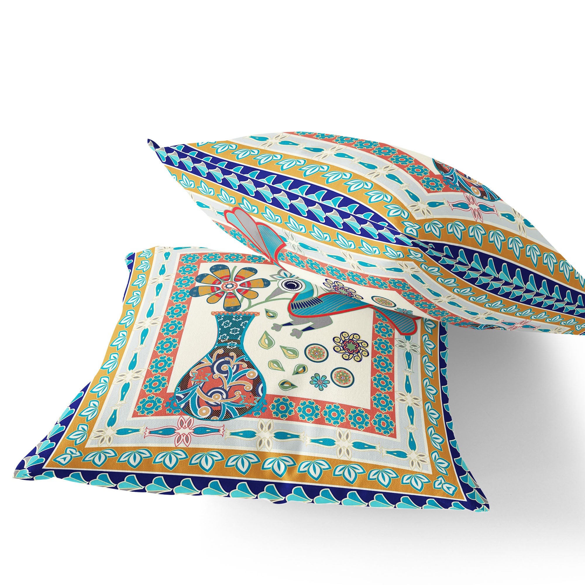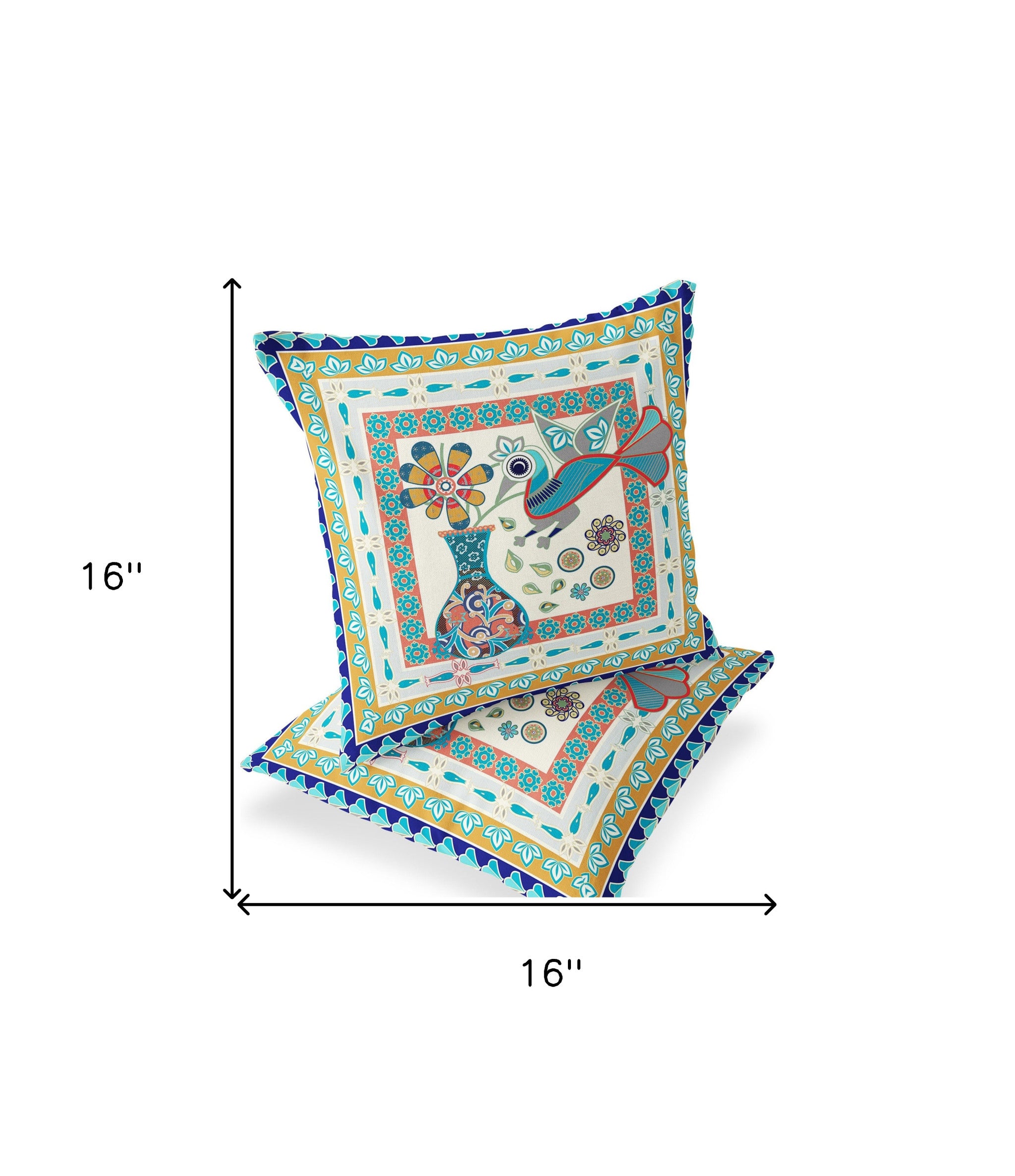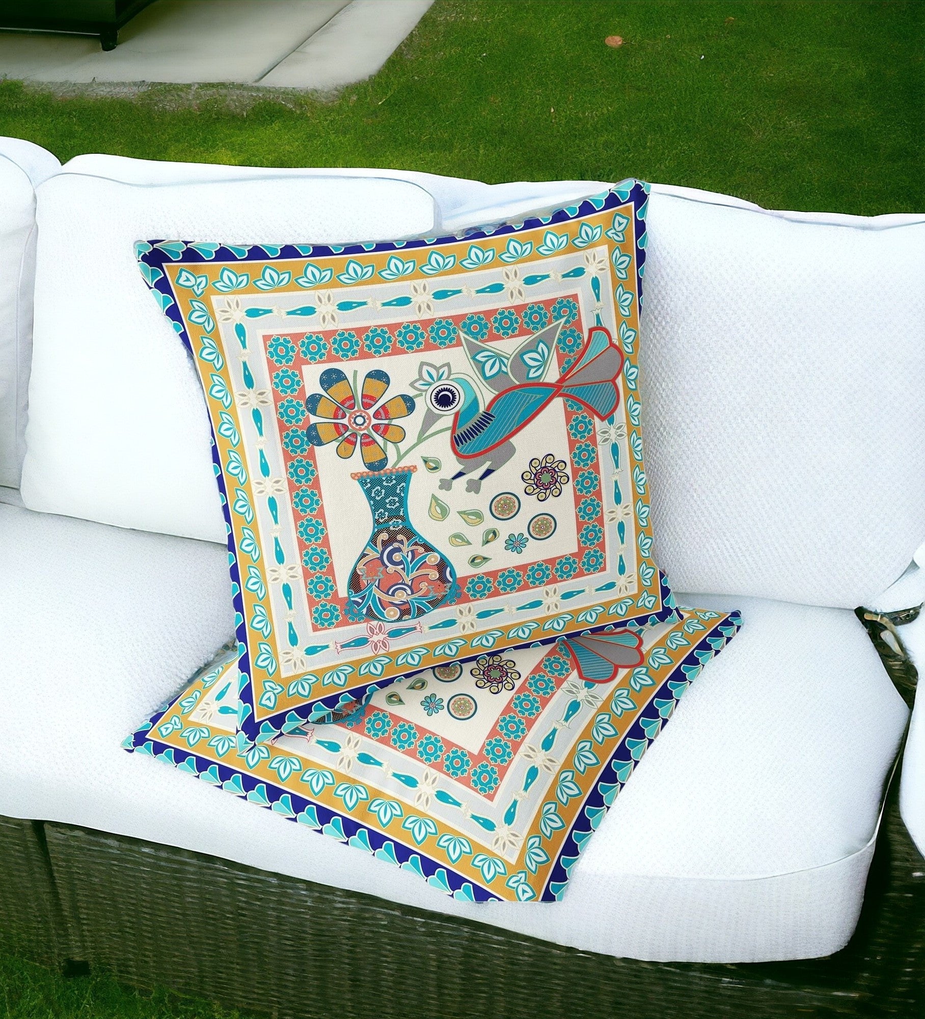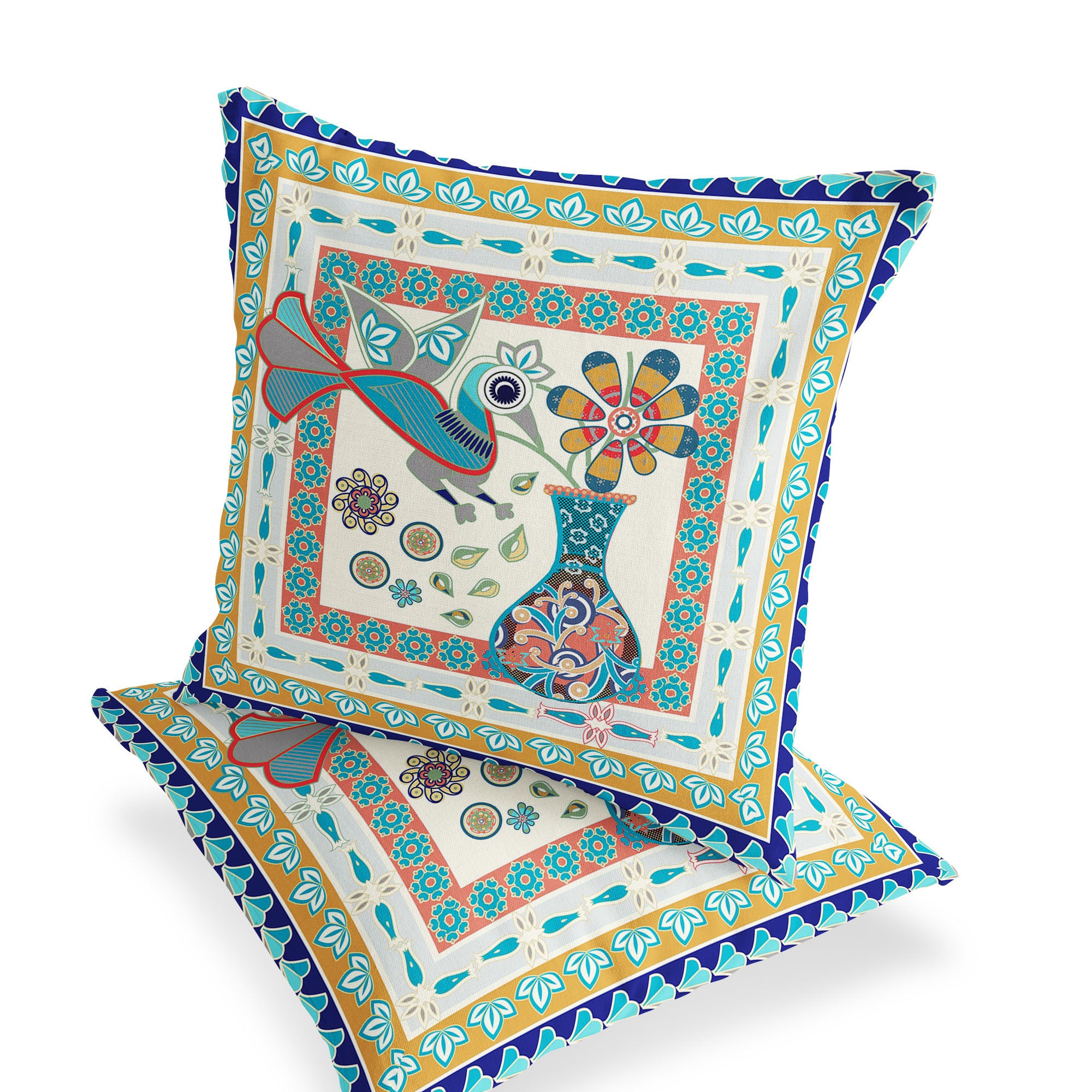 Set of Two 16" X 16" Blue and Gold Peacock Blown Seam Floral Indoor Outdoor Throw Pillow