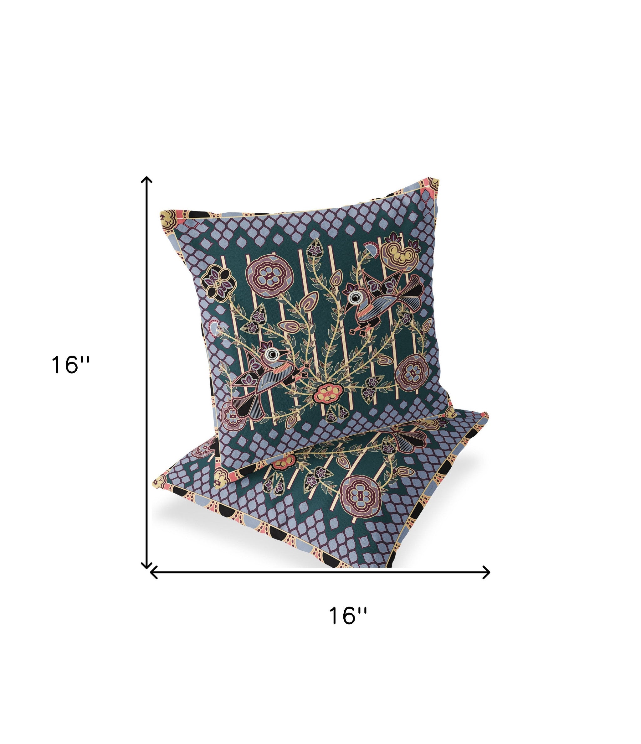 This set of two 16-inch x 16-inch green and pink peacock blown seam floral indoor outdoor throw pillow will add a beautiful decorative accent to your decor. These great looking soft decorative pillows are expertly made of durable and long lasting polyester in a green and pink coloration. Will add some color and dimension to your space indoors or out. A great decorative accessory for your favorite chair or to accent your sofa. 16-inch H x 16-inch W x 5-inch D
