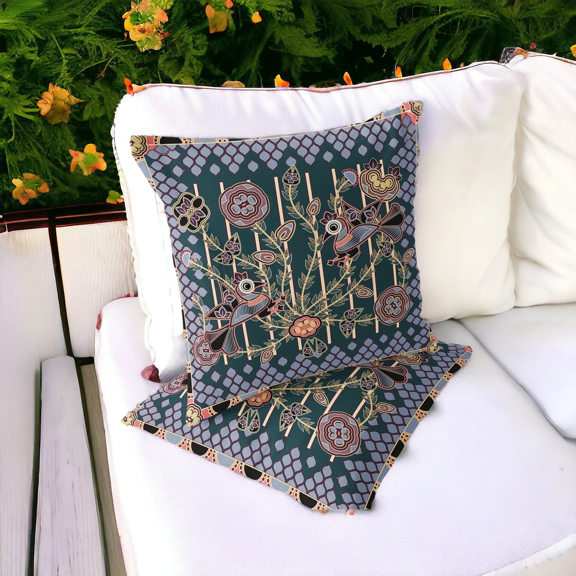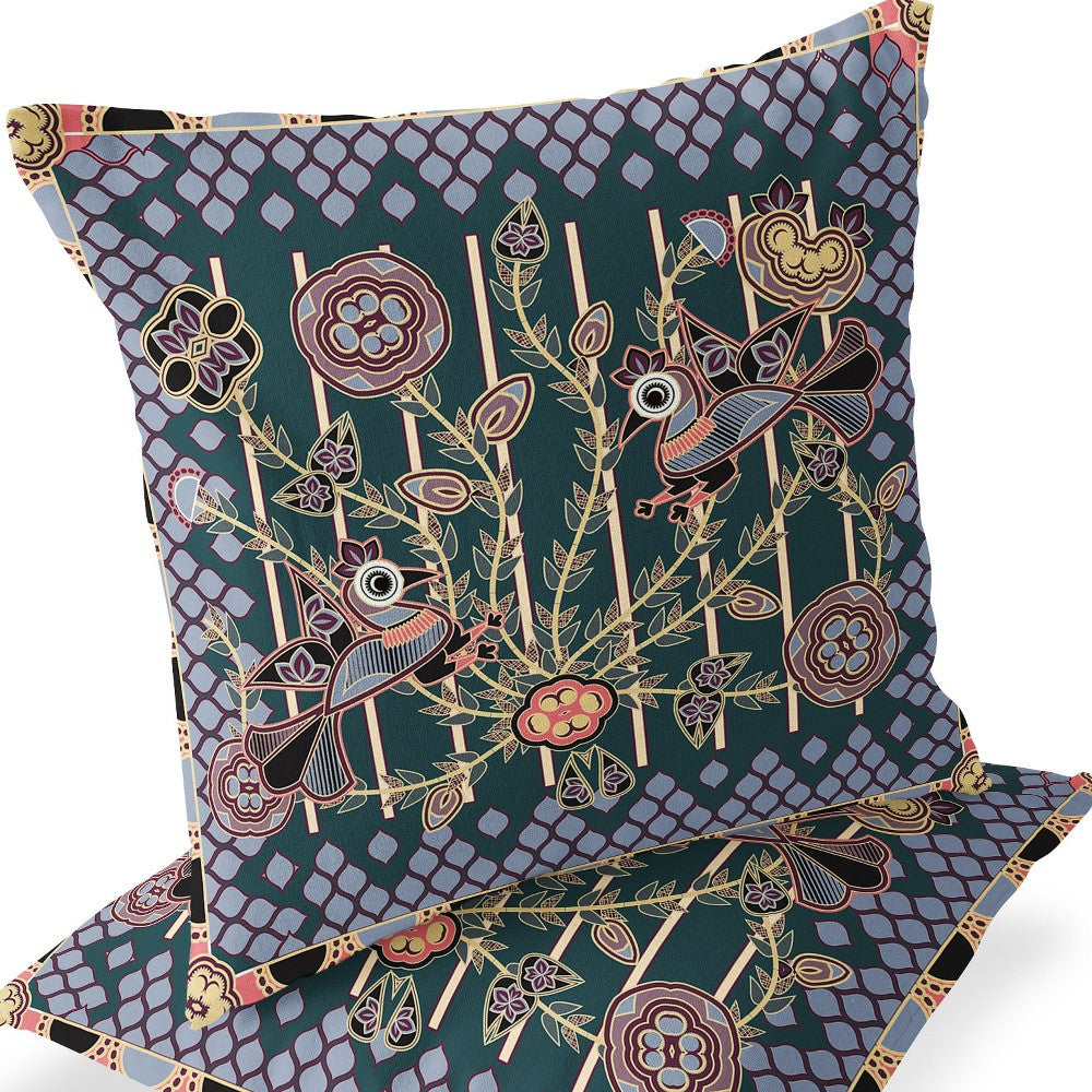 Set of Two 16" X 16" Green and Pink Peacock Blown Seam Floral Indoor Outdoor Throw Pillow