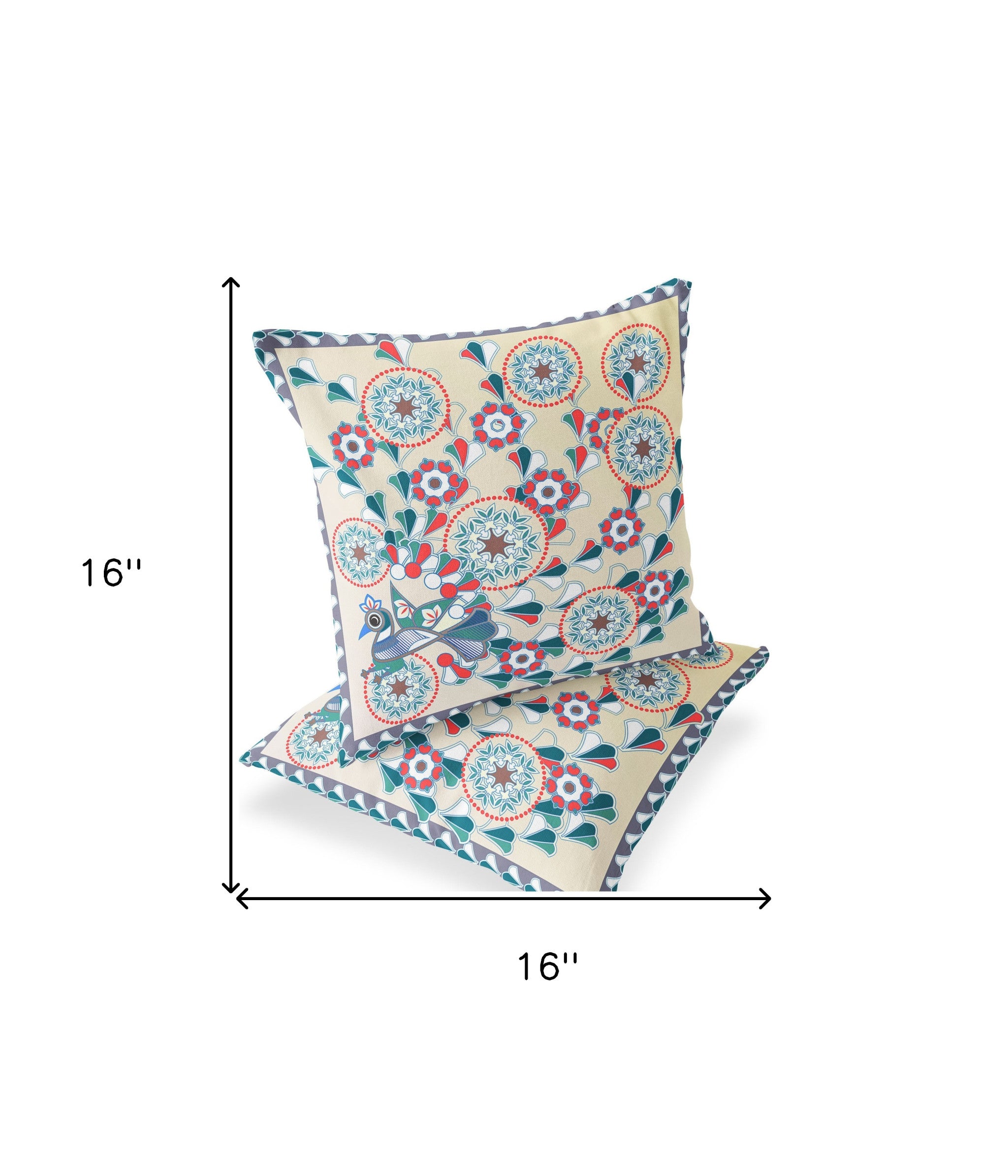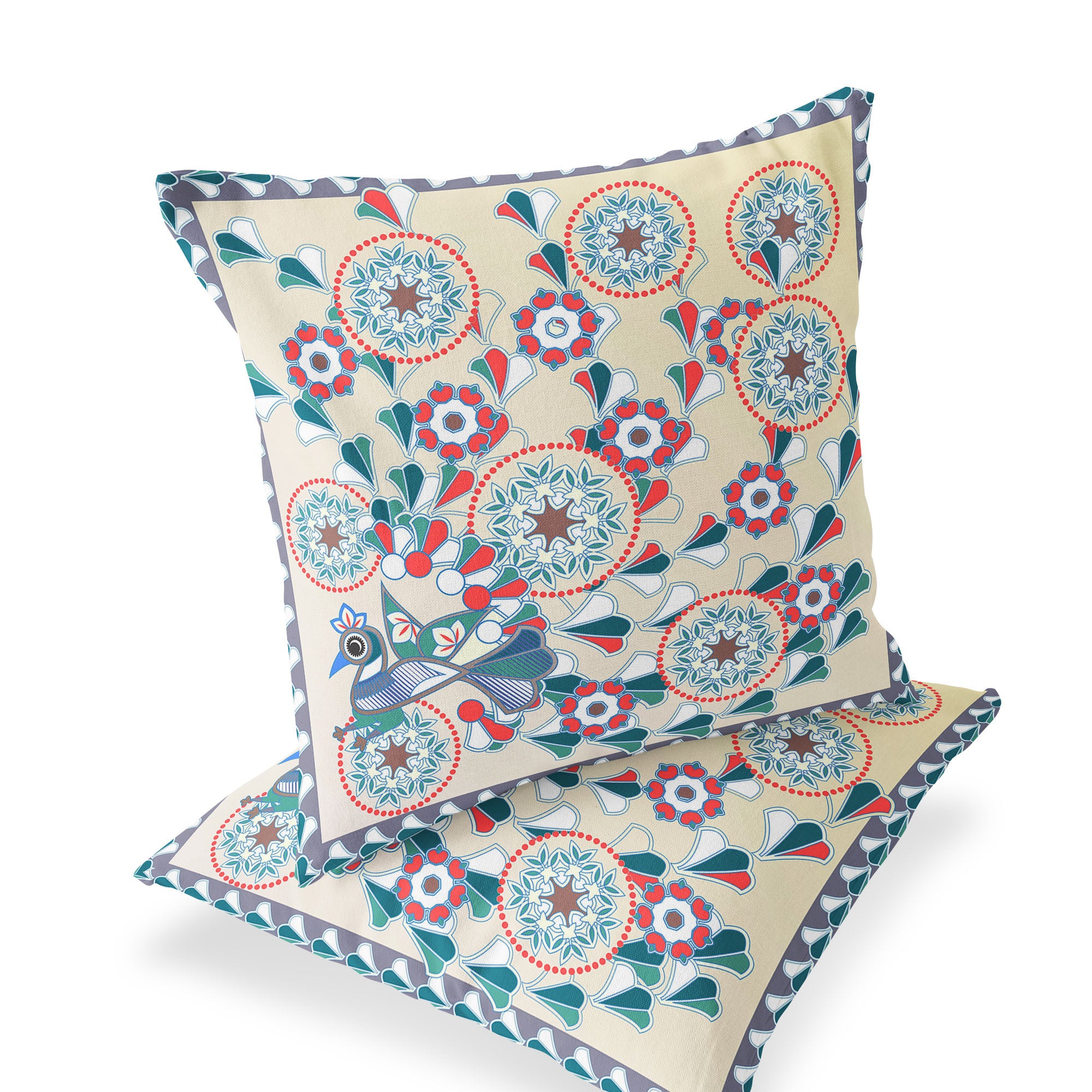 Set of Two 16" X 16" Green and Red Peacock Blown Seam Floral Indoor Outdoor Throw Pillow
