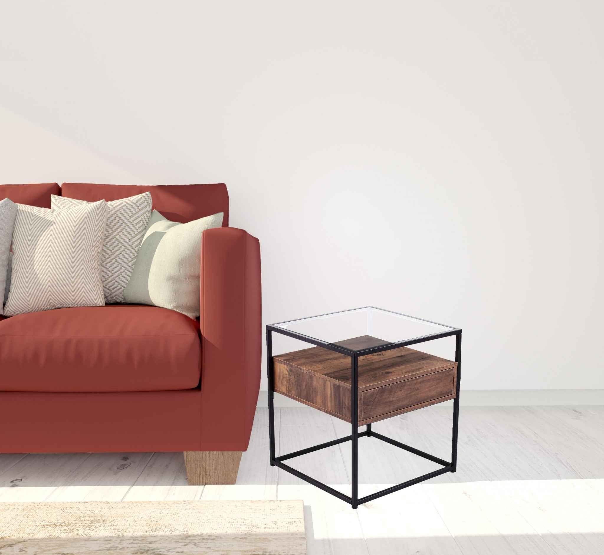 22" Black Glass And Iron Square End Table With Drawer With Shelf