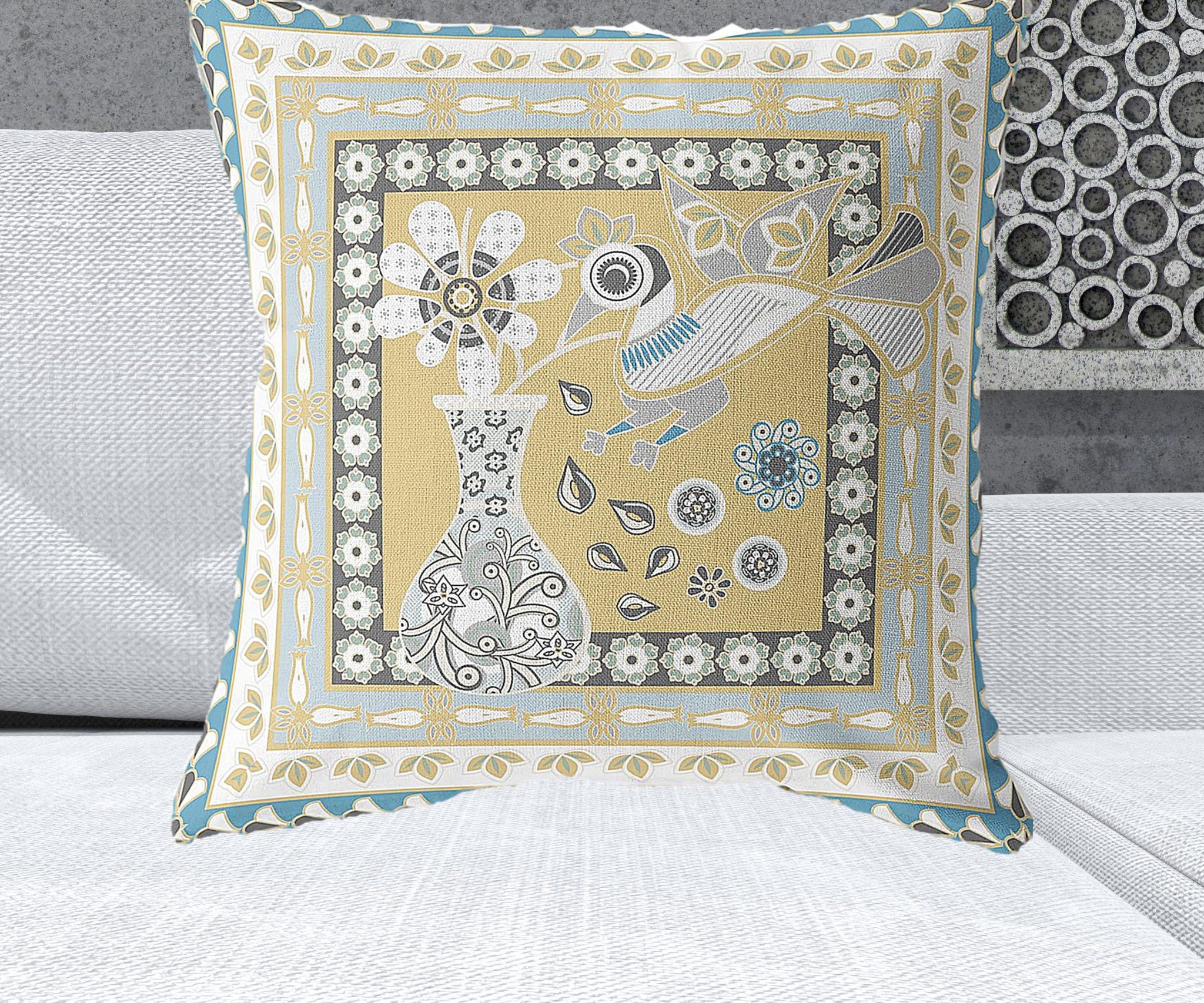 26" x 26" Beige and White Peacock Blown Seam Floral Indoor Outdoor Throw Pillow