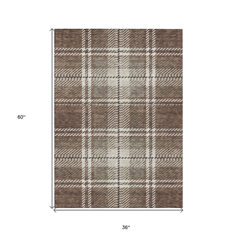 3' X 5' Brown Black And Ivory Plaid Washable Indoor Outdoor Area Rug