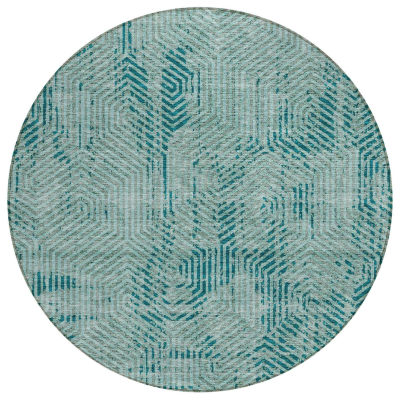 8' Teal Blue And Gray Round Geometric Washable Indoor Outdoor Area Rug