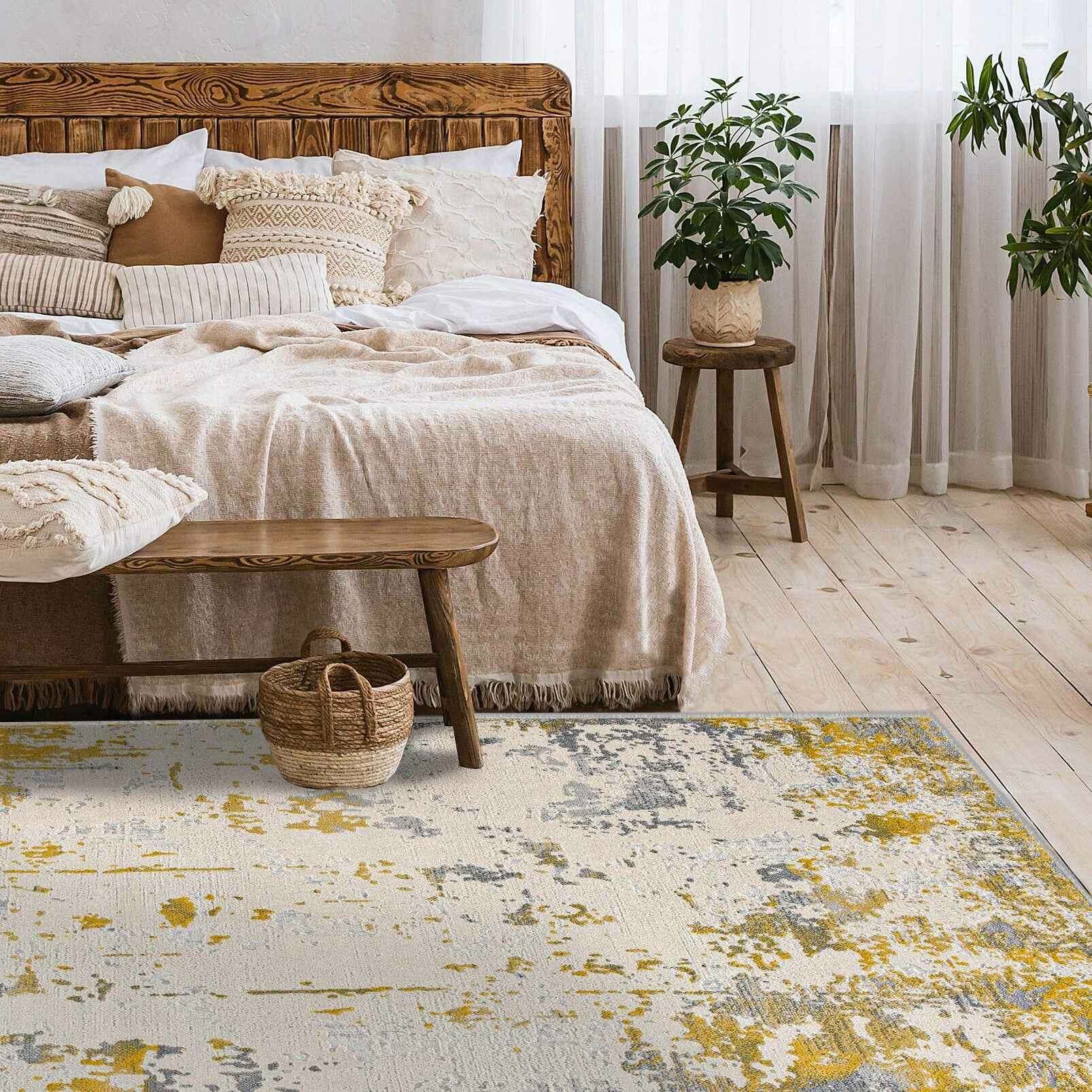 Set an inviting tone in your space with this 4' x 6' gold abstract dhurrie area rug. This rectangle shaped rug features a abstract design in gold to give it visual interest. A classic shape marries with good looking design for your space Made in Turkey, this rug offers high quality combined with good looking designer sensibilities. Place this area rug against a hardwood or tile floor and it will enliven your living space with style and sophistication. 0.8" H x 45" W x 66" D