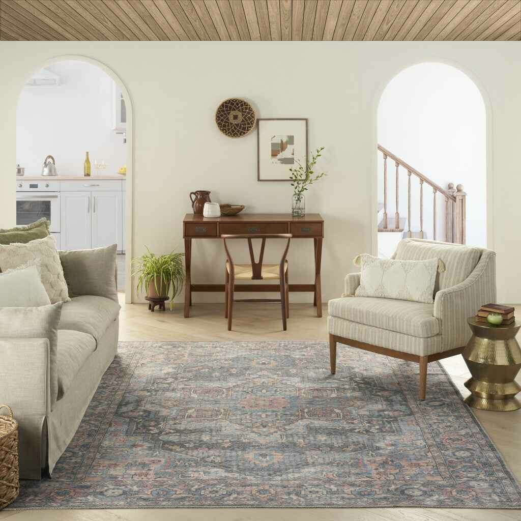 8' X 10' Blue Floral Power Loom Distressed Washable Area Rug