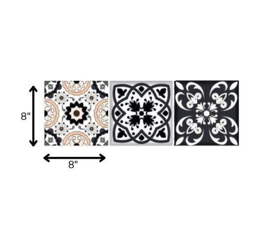 The possibilities are endless with these 8" x 8" Black White and Tan Peel and Stick Removable Tile stickers. These fabulous peel and stick tiles will add sophisticated flair and design to your kitchen backsplash, fireplace mantel, stair treads, half wall, bathroom or nook. These 8" square tile stickers are an easy, no mess solution to complete a personalized and colorful room makeover. Easy to apply on any clean dry flat surface, and easy to remove. Multi use and multi-room appeal make this design option is perfect for renters, landlords, college students and homeowners alike. Peel and stick tile decals make it easy to turn your space into a home. Removable without damage to surfaces. One kit contains 24 stickers. Kit includes multiple design styles and colorations to be displayed in any arrangement you choose.