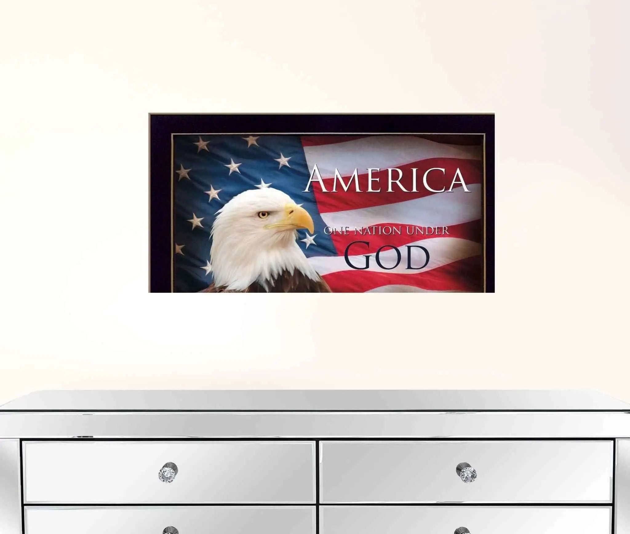 Bring some sizzle to your space with this eye-catching one nation under god flag black framed print wall art. This print is a visual artistic expression that allows you to decorate your space in style. Reproduced for you on paper, this hanging decorative accent will be a trendy and fashionable way to dress your walls. Adding this hanging wall art to your space to make your room feel more finished and attractive. Utilize this opportunity to create a focal point in the room with this fabulous wall decor option. 14 inches H x 20 inches W x 1 inches D