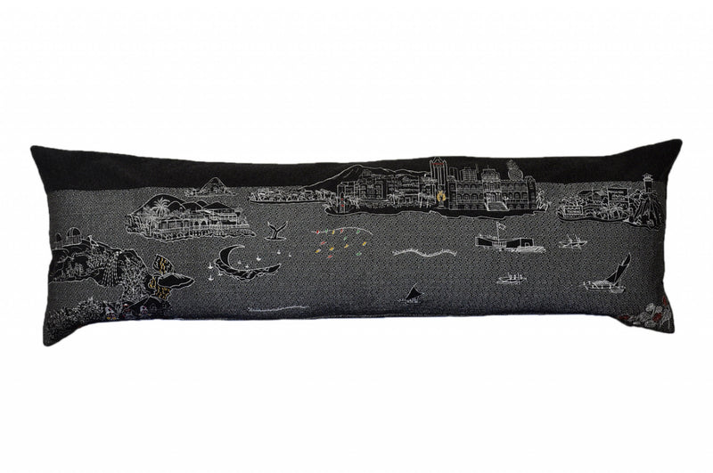 Showcase one of the most famous destinations in the world with our Black Color Hawaii Nighttime Skyline King Size Lumbar Decorative Pillow. This Nighttime view of the Hawaiian Islands from the Pacific Ocean, is a stunning way to represent one of the most beloved set of islands. The gorgeous art features famous references and landmarks from the islands including Pearl Harbor, Palm Trees, and the Iolani Palace, rendering a modern whimsical way to bring this iconic state to life. Made of a wool/nylon blend, this high quality stitched decorative pillow features white on black embroidered artwork mixed with pops of color that highlight important and recognizable icons from this fabulous city. This pillow makes a great gift, decorative accent and conversation piece. 4" x 45" x 14"