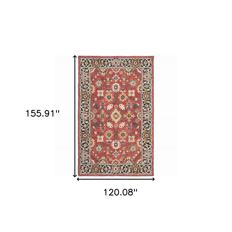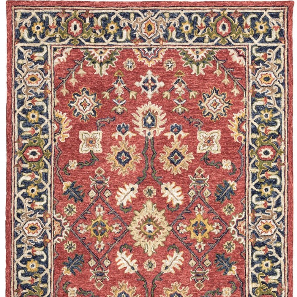 Offering the charm of traditional styling, this Red and Blue Bohemian Area Rug is an ideal accent to add a dramatic touch to your living space. The rug features a bold border with intricate patterns in spruce blue and ivory combined with a series of ikat-styled floral motifs in the center on a soft red base. Made with space-dyed wool for durability and the handcrafted loop-pile construction adds to its rich surface texture. The blend of bold and neutrals make this area rug a compelling piece to add an antique flair to your space. 1” x 120.08” x 155.91”