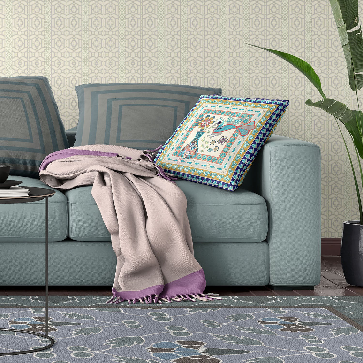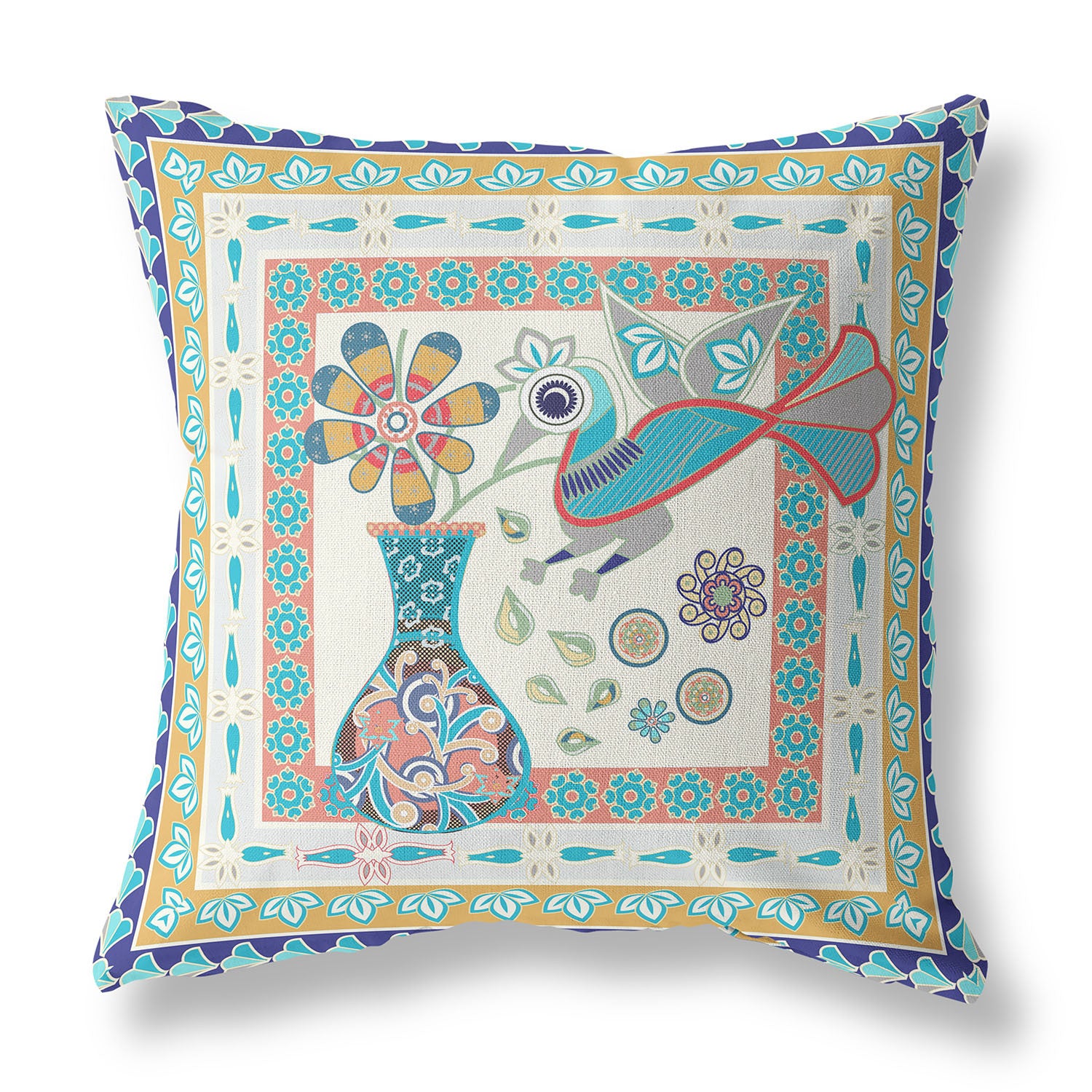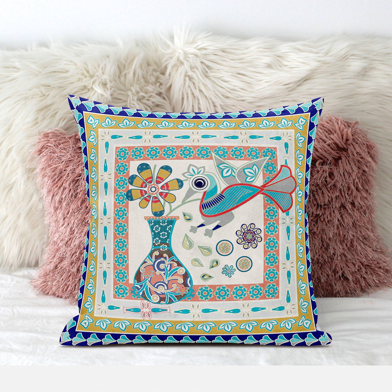 16" x 16" Blue and Beige Peacock Blown Seam Floral Indoor Outdoor Throw Pillow
