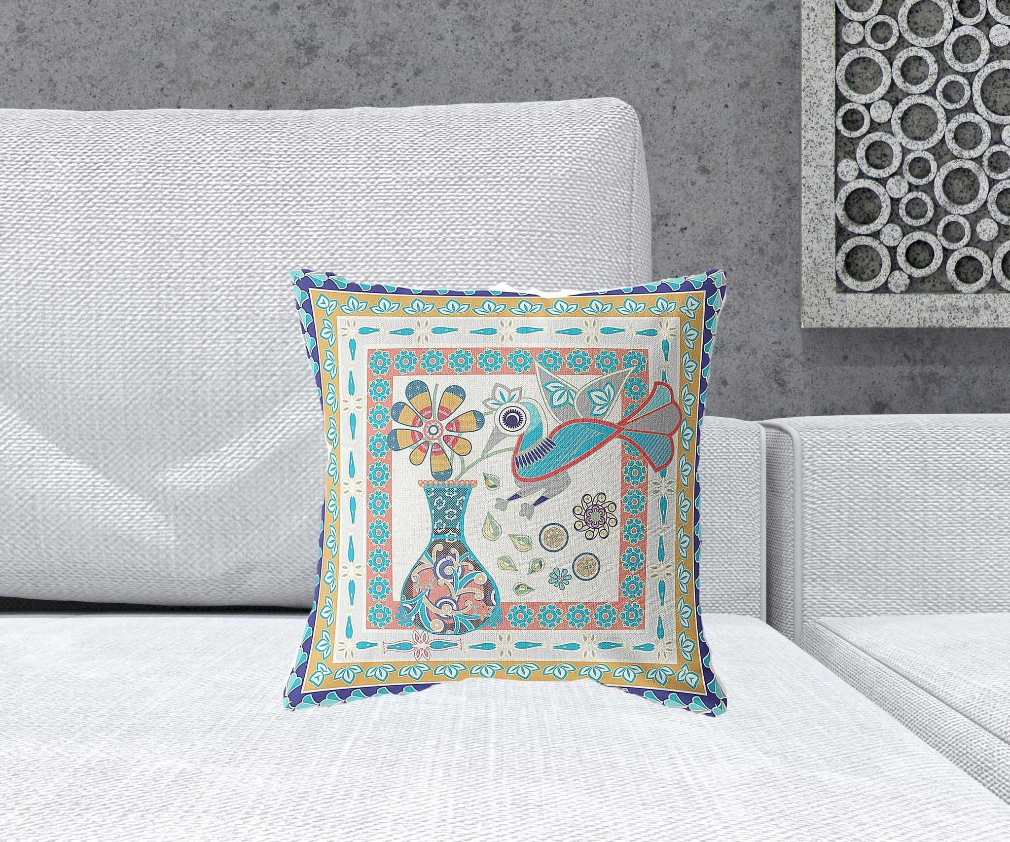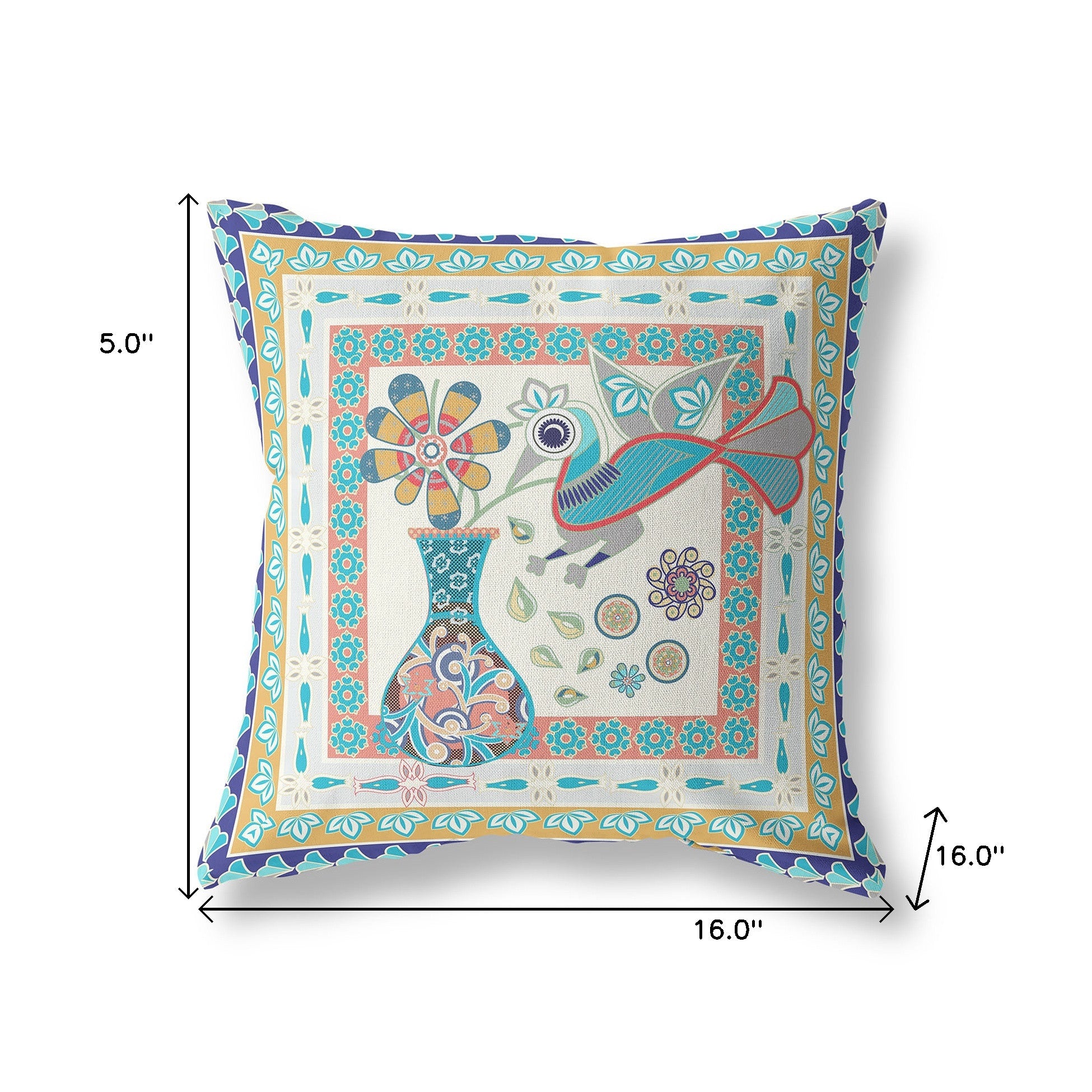 Unique and decorative, this comfortable 16" x 16" blue and beige bird blown seam abstract indoor outdoor throw pillow will leave a lasting impression. Durable blue and beige broadcloth has been used to give this pillow a beautiful look that will stand the test of time. A great decorative accessory to decorate indoors or out. Great to use on its own or mix with other decorations for the perfect look. 5" H x 16" W x 16" D
