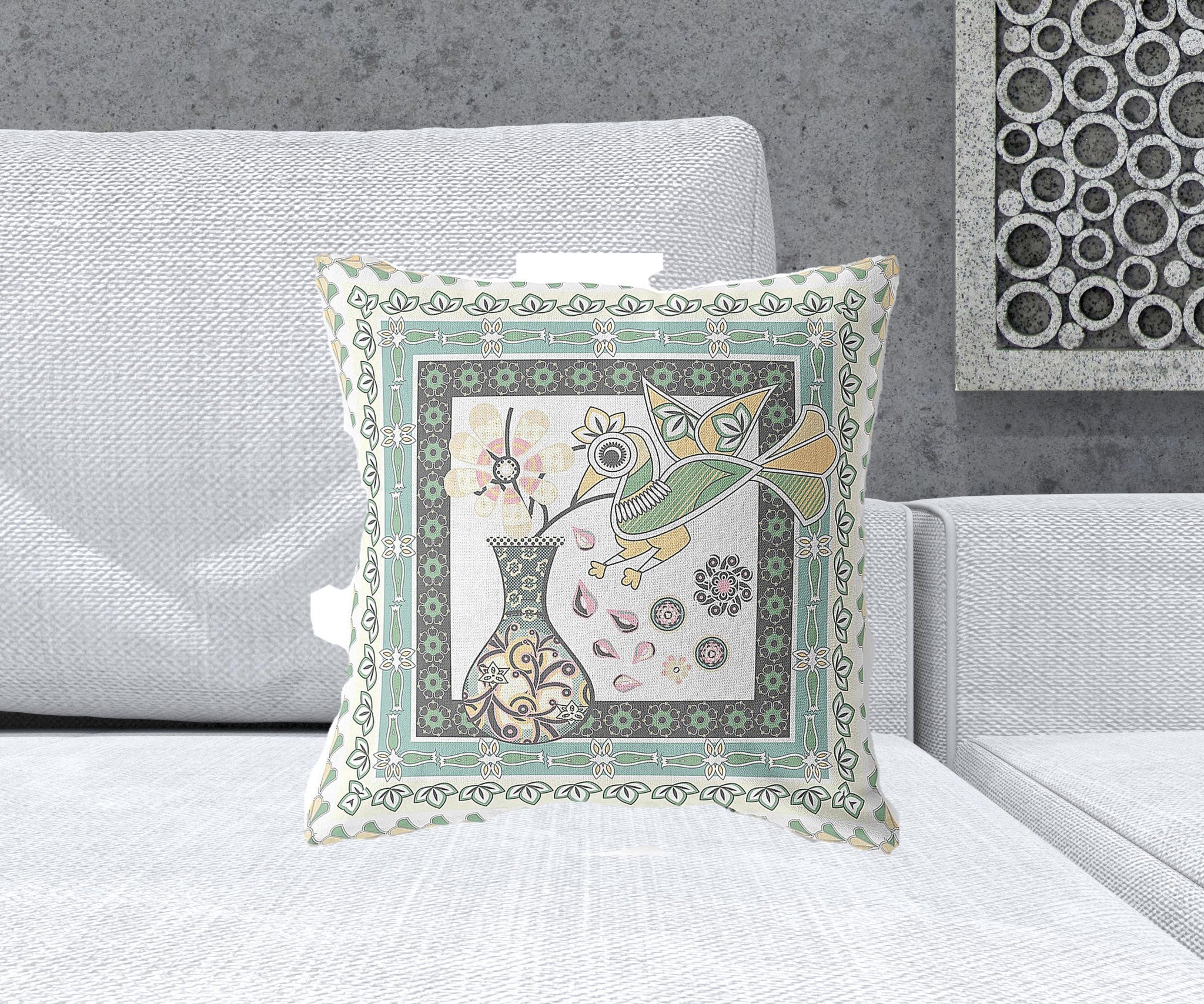 18" x 18" Green and White Bird Blown Seam Floral Indoor Outdoor Throw Pillow