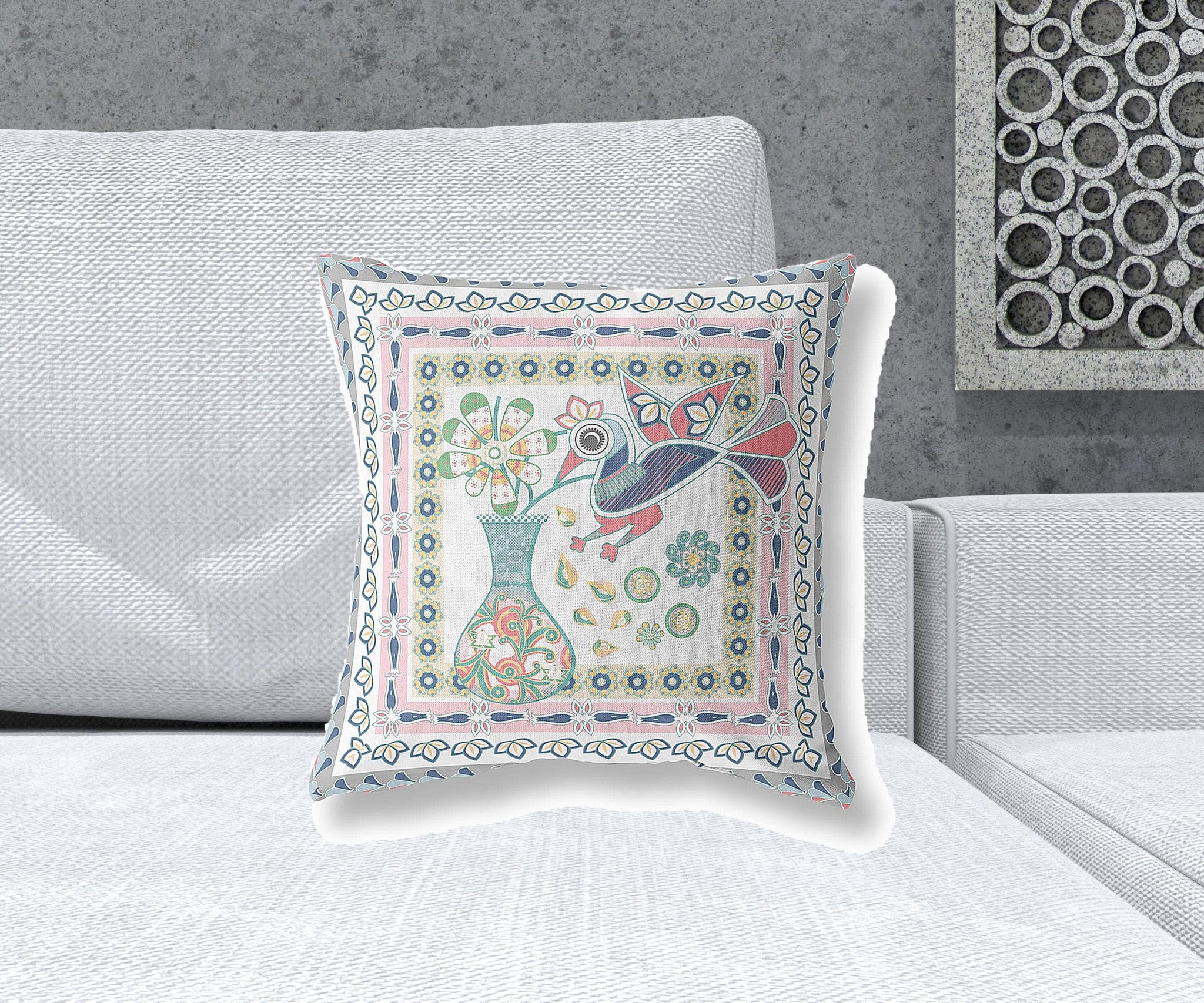 18" X 18" White And Grey Bird Blown Seam Floral Indoor Outdoor Throw Pillow