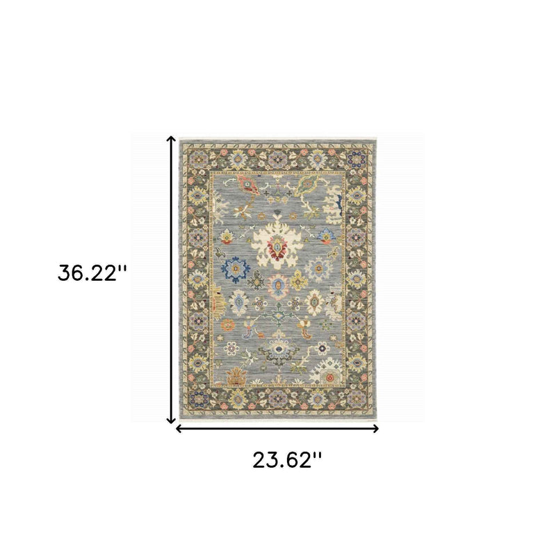 This 2' x 3' blue grey gold green pink orange ivory and red oriental power loom stain resistant area rug with fringe, is a great way to add warmth to a room. This rectangle shaped rug features a oriental design in blue grey gold green pink orange ivory and red to give it visual interest. A classic shape marries with good looking design for your space Ideal for spaces with kids and pets, this rug is stain resistant to help repel stains and spilled liquids. Tassel ends bring a timeless and fashionable look to your interior. Area Rugs help to give warmth and sense of home to your space. 0.31" H x 23.62" W x 36.22" D