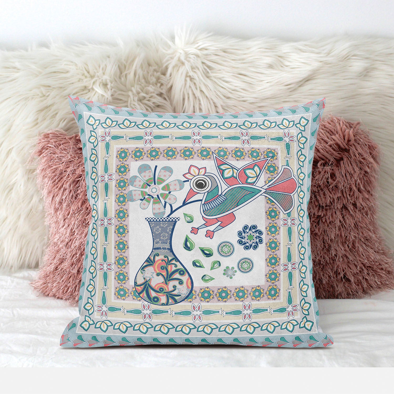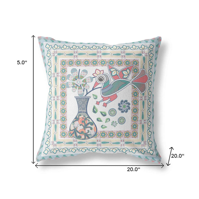 20" X 20" White And Blue Bird Blown Seam Floral Indoor Outdoor Throw Pillow