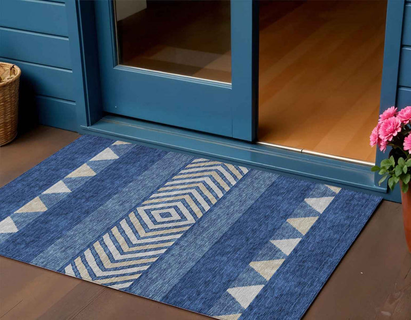 3' X 5' Navy Blue Ivory And Beige Southwestern Washable Indoor Outdoor Area Rug