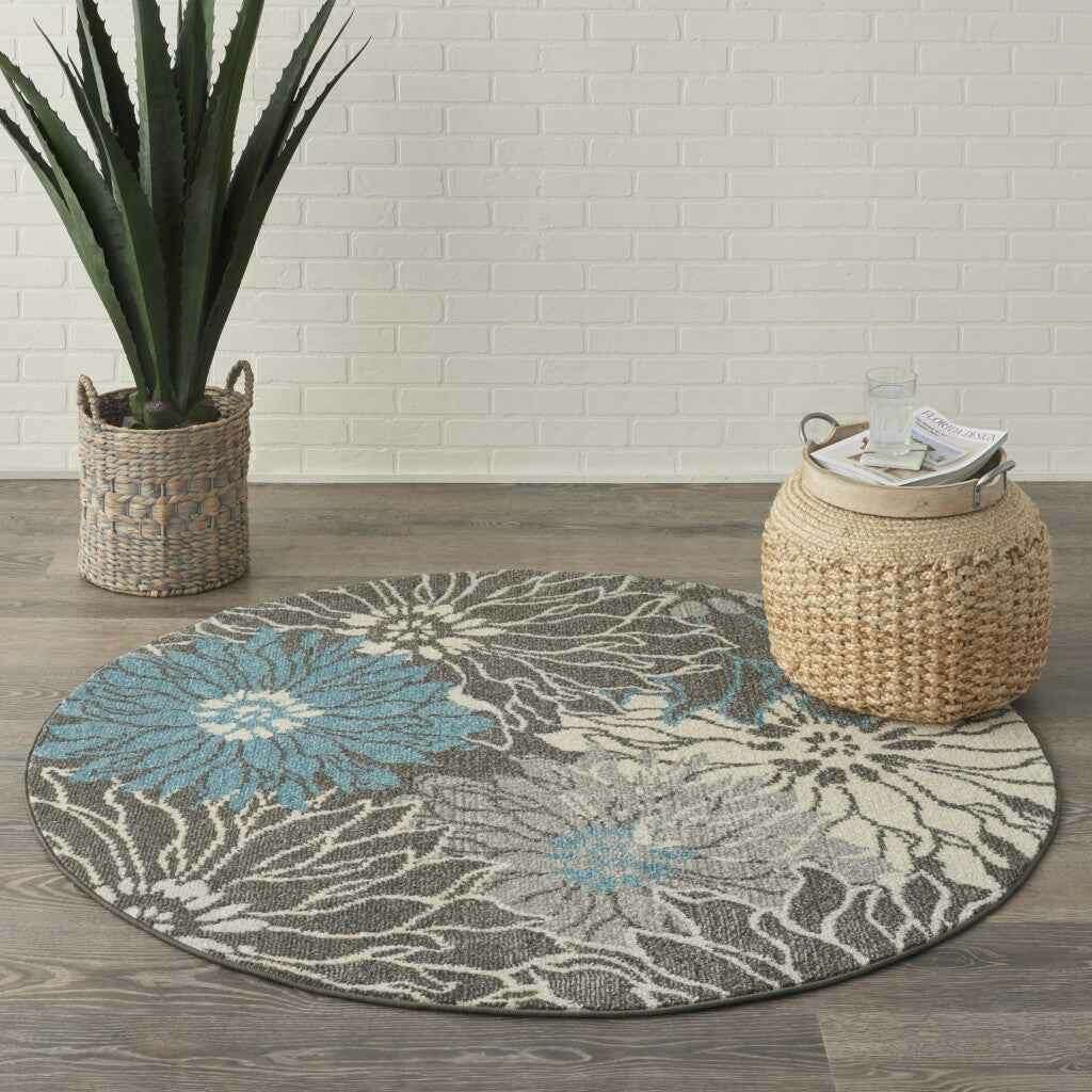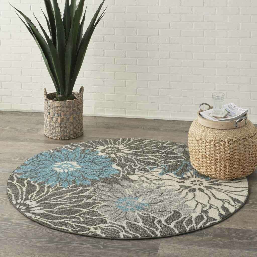 This 4' blue and gray round floral power loom area rug, is a great way to add warmth to a room. This geometric round shaped rug features a floral pattern in blue and gray that combines a good looking print with a unique and updated shape. The mix of shape, color, and design gives this rug refreshing visual interest. Made in Turkey, this rug offers high quality combined with good looking designer sensibilities. Place this area rug against a hardwood or tile floor and it will enliven your living space with style and sophistication. 1" H x 48" W x 48" D