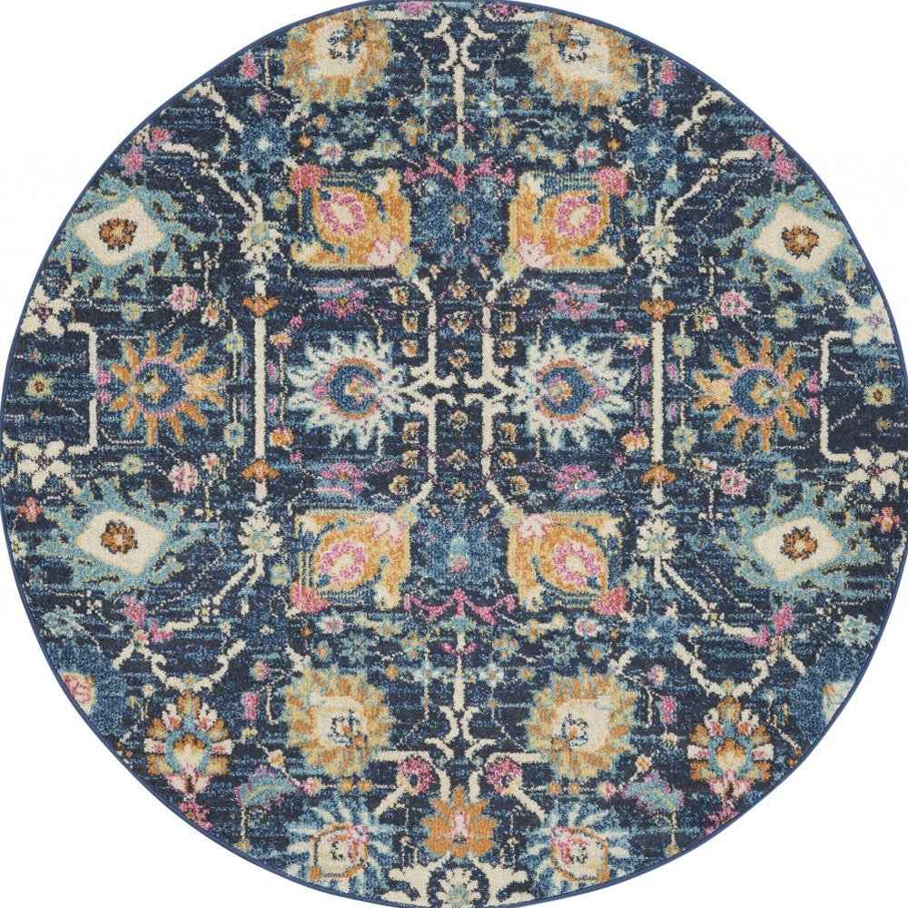 This 4' navy blue round floral power loom area rug, is a great way to add warmth to a room. This geometric round shaped rug features a floral pattern in navy blue that combines a good looking print with a unique and updated shape. The mix of shape, color, and design gives this rug refreshing visual interest. This superior Turkish rug represents the highest quality and is built to last. Place this area rug against a hardwood or tile floor and it will enliven your living space with style and sophistication. 1" H x 48" W x 48" D