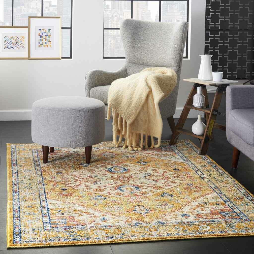 Add great coloration and comfortable texture to your space with this 4' x 6' yellow and ivory dhurrie area rug. This superior Turkish rug represents the highest quality and is built to last. Place this area rug against a hardwood or tile floor and it will enliven your living space with style and sophistication. 1" H x 45" W x 69" D