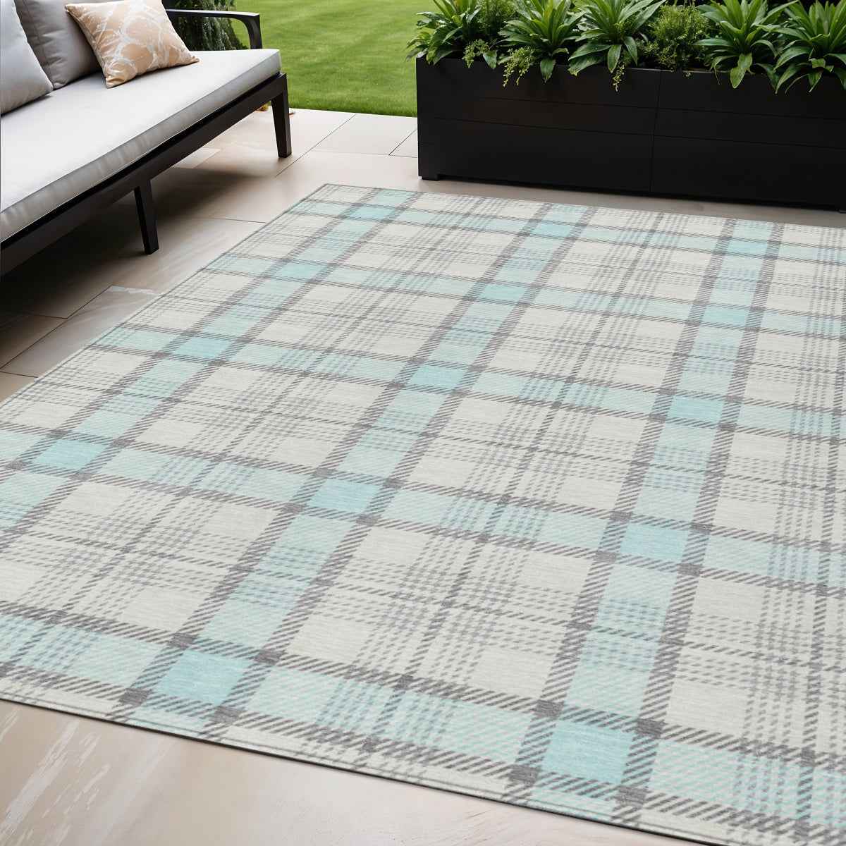 Add great coloration and comfortable texture to your space with this 5-foot x 8-foot sky blue and gray plaid washable indoor outdoor area rug. This rectangle shaped rug features a plaid design that will work well both indoors or out. A classic shape marries with good looking design for your living room, hall, bedroom, porch, patio, or poolside. Ideal for outdoor spaces or high traffic areas with kids and pets, this rug is made from heavy duty polyester that is stain resistant to help repel water, dirt, and stains. Versatile in use, durable, and easy to maintain, this rug is an ideal solution to add a decorative and inviting touch to your indoor or outdoor space. 60-inch h x 90-inch w x 0.19-inch d.