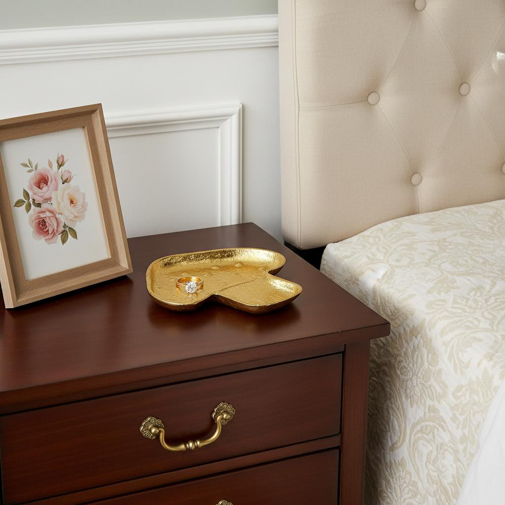 Intended for decorative, non-food use only, it's perfect for displaying a collection of candles, perfume, décor, and more. This trinket tray combines functionality and artistry, making it an exceptional addition to your home. Crafted from durable cast iron, it promises longevity while exuding an air of elegance. The solid gold color adds a touch of luxury, seamlessly enhancing any traditional decor theme. Handmade with care, each piece showcases unique characteristics that reflect skilled craftsmanship. Elevate your space with this exquisite tray, perfect for organizing small treasures or as a standout centerpiece on your coffee table or dresser. 0.75-inch h x 6.75-inch w x 7.00-inch d.