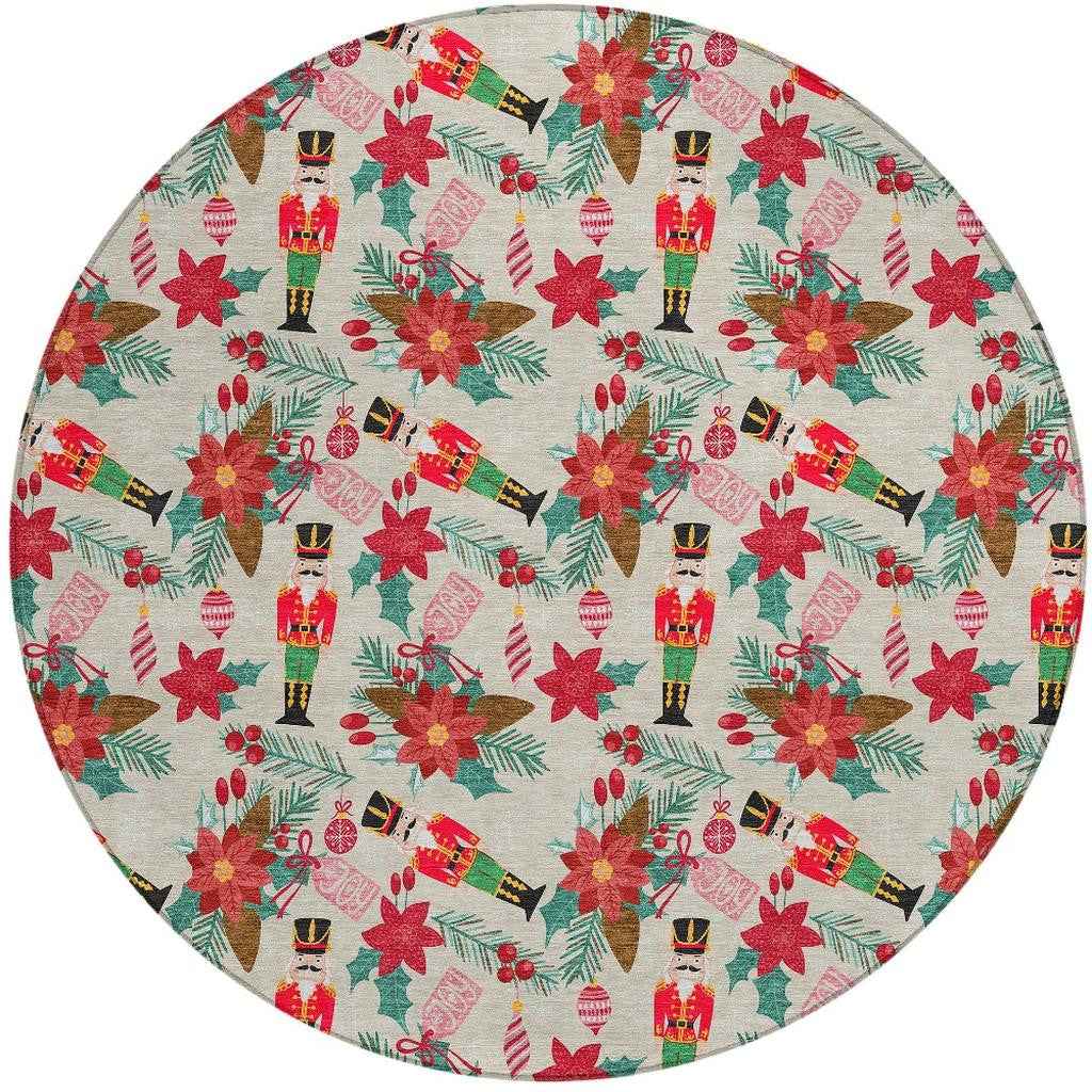 8' Beige Red Black Pink And Brown Round Floral Washable Indoor Outdoor Area Rug