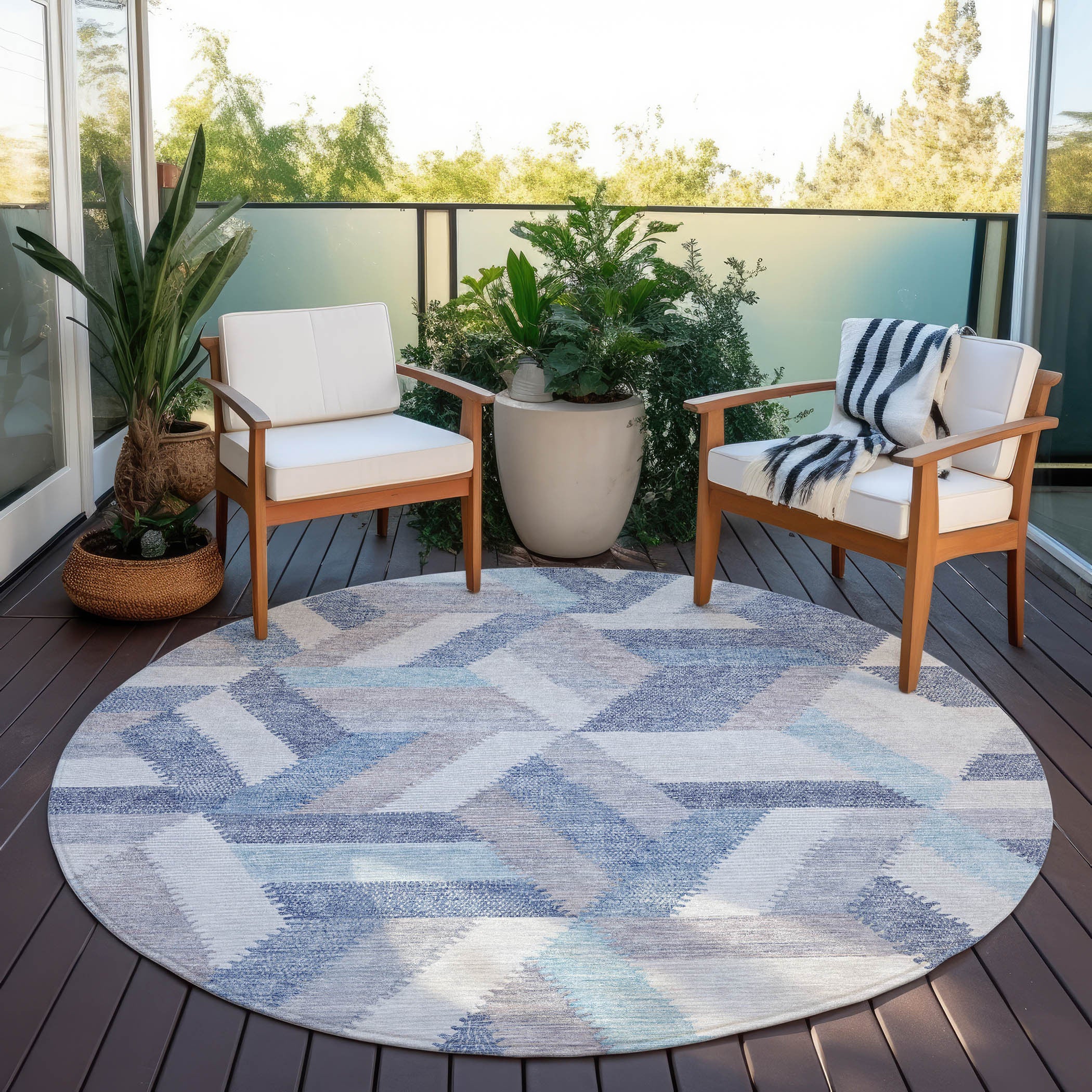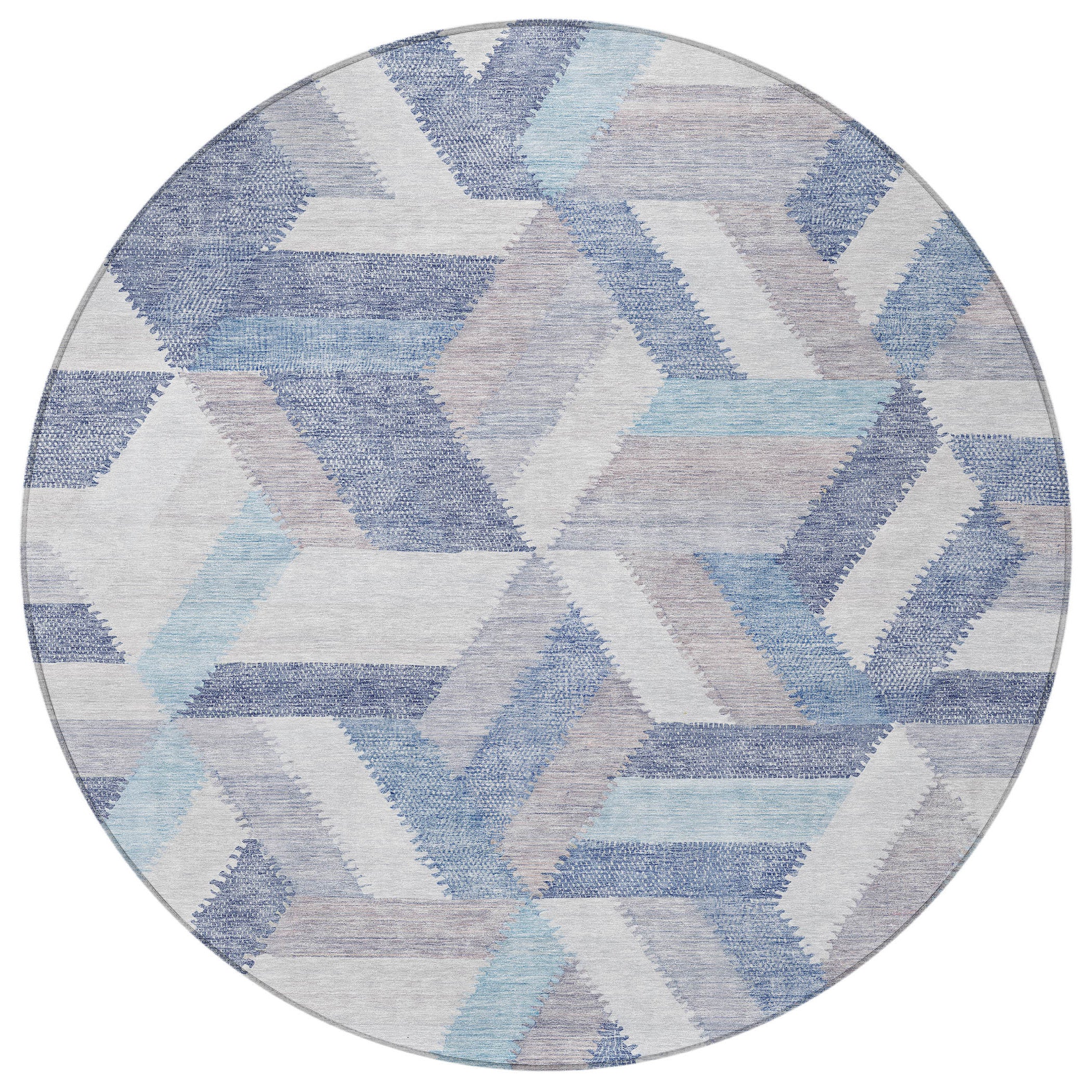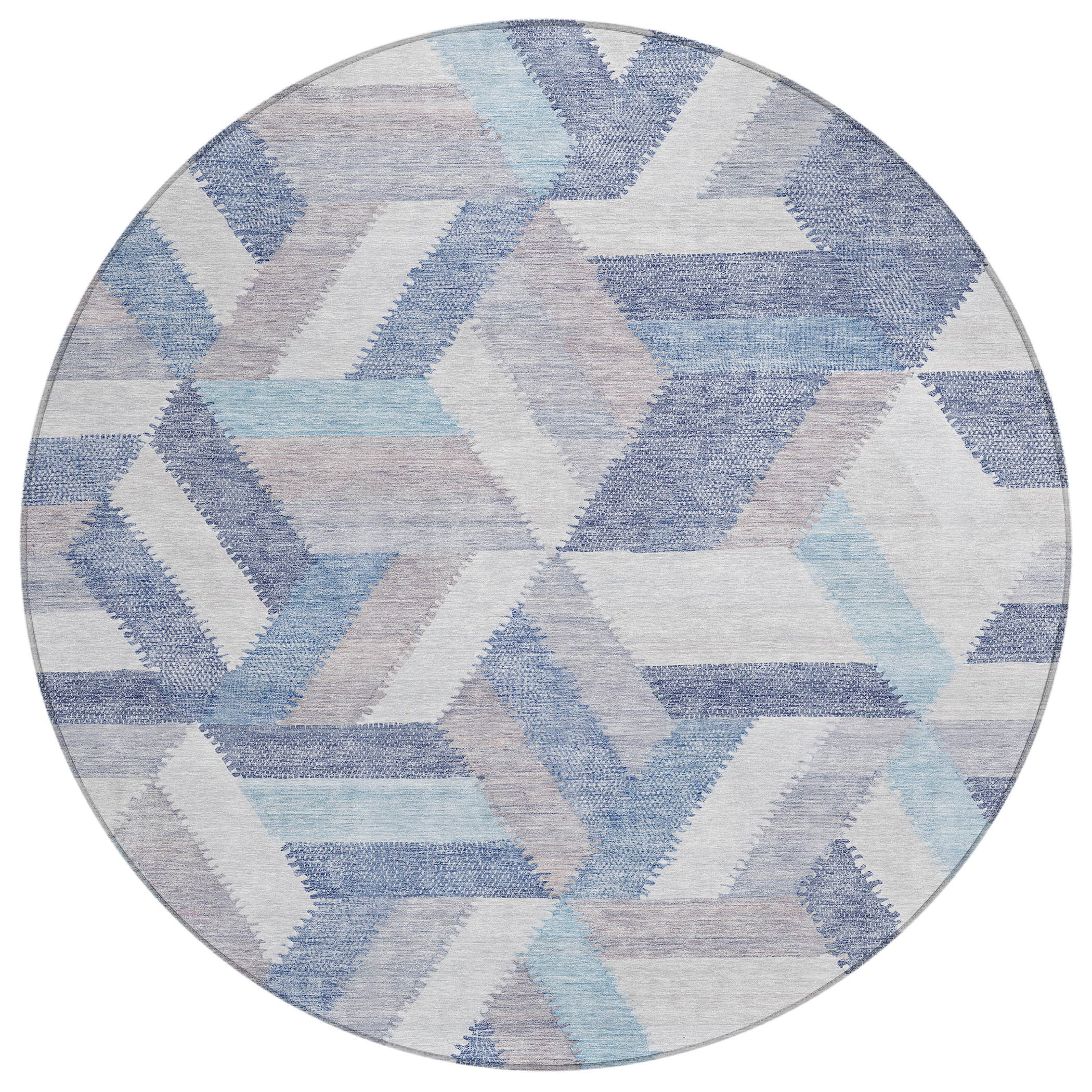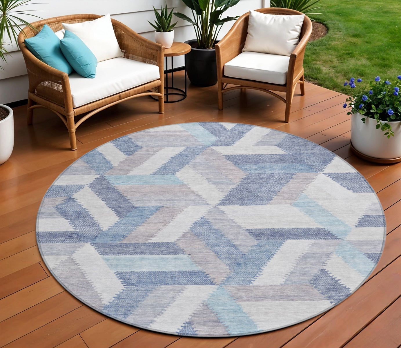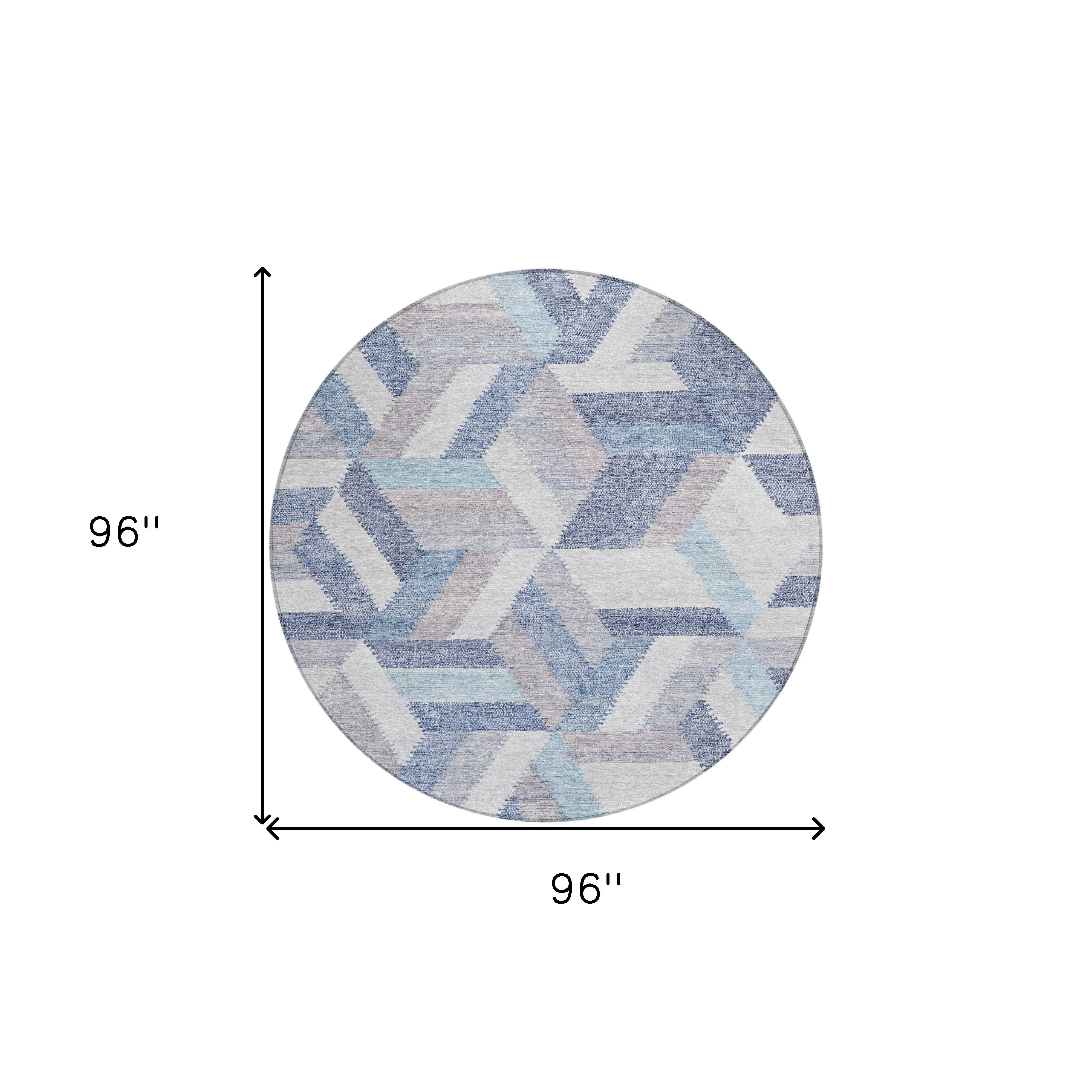 8' Denim Blue Round Geometric Washable Indoor Outdoor Area Rug