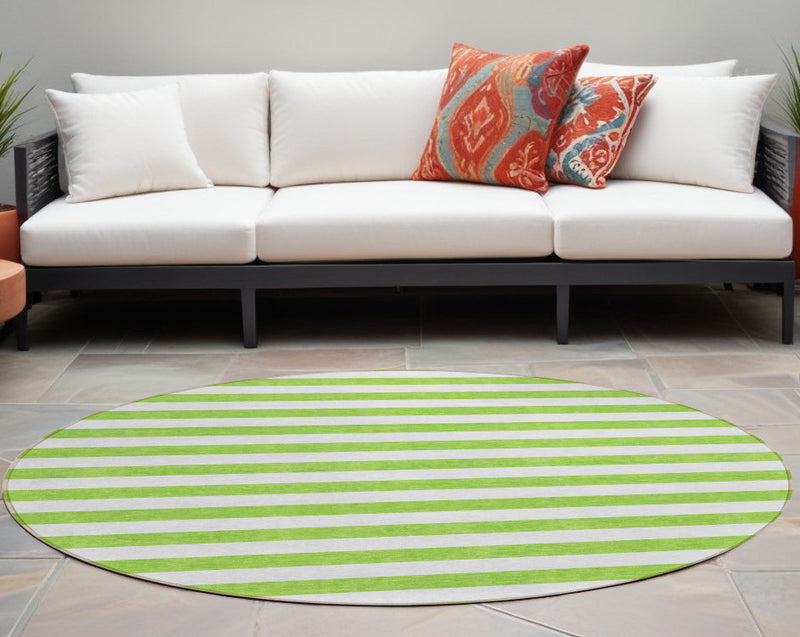 8' Round Green and White Round Striped Washable Non Skid Indoor Outdoor Area Rug