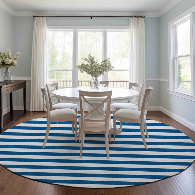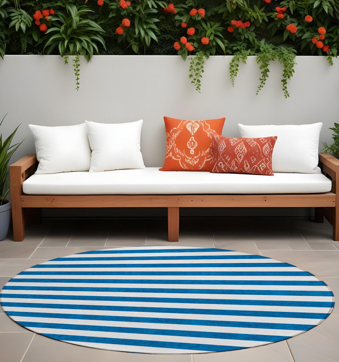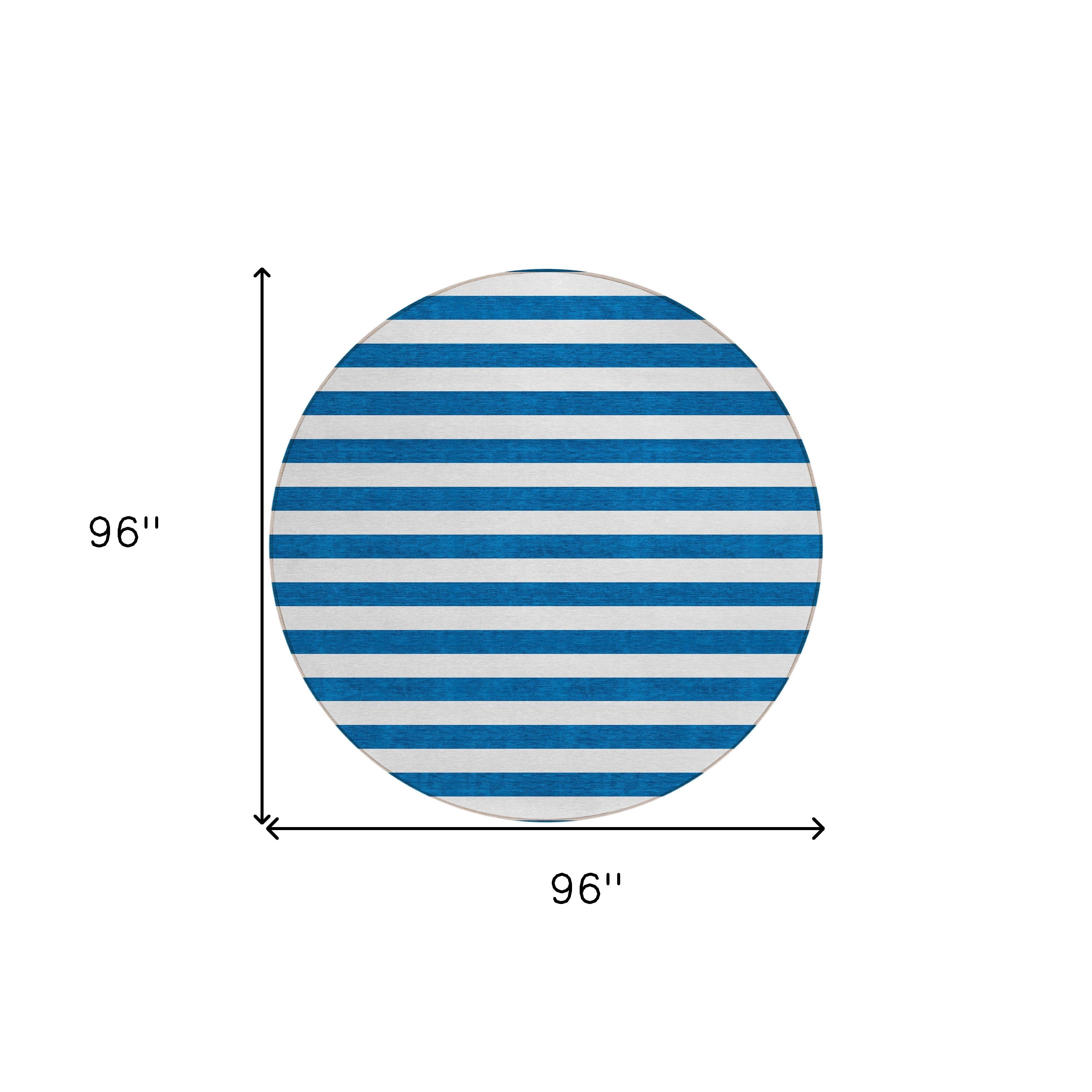 8' Round Navy Blue Round Striped Washable Non Skid Indoor Outdoor Area Rug