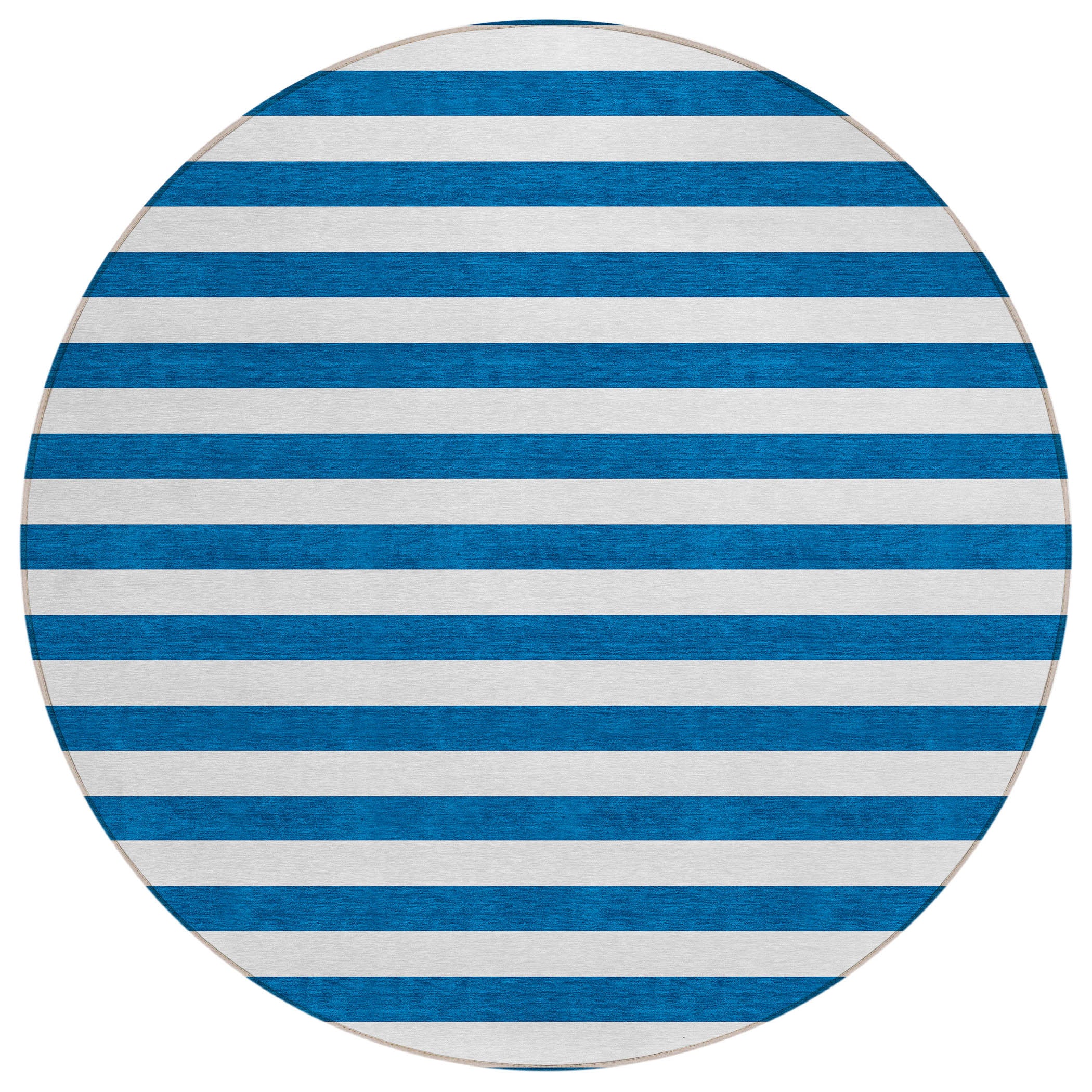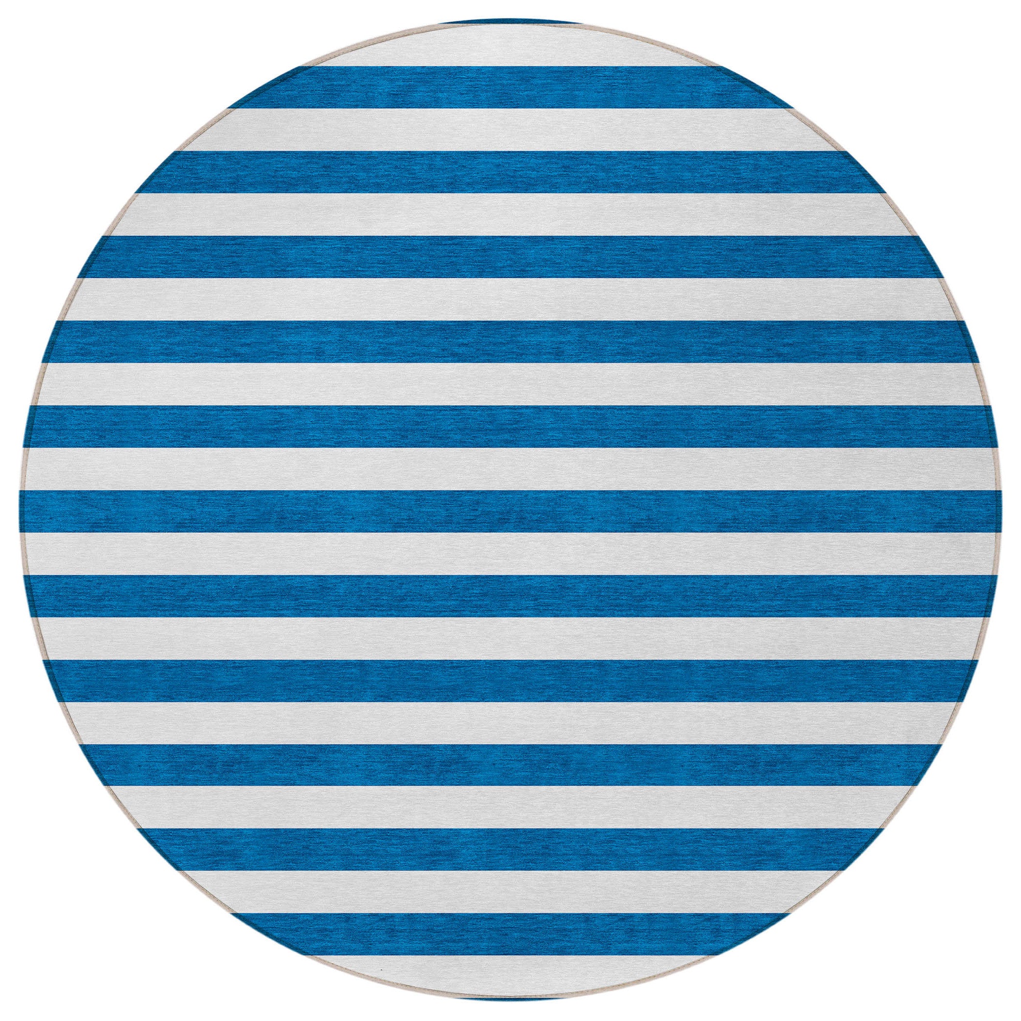 Set an inviting tone in your space with this 8-foot round navy blue round striped washable stain resistant non skid indoor outdoor area rug. This geometric round shaped rug features a striped pattern in navy blue that combines a good looking print with a unique and updated shape. The mix of shape, color, and design gives this rug refreshing visual interest. Ideal for spaces with kids and pets, this rug is stain resistant to help repel stains and spilled liquids. Place this area rug against a hardwood or tile floor and it will enliven your living space with style and sophistication. 96-inch H x 96-inch W x 0.19-inch D