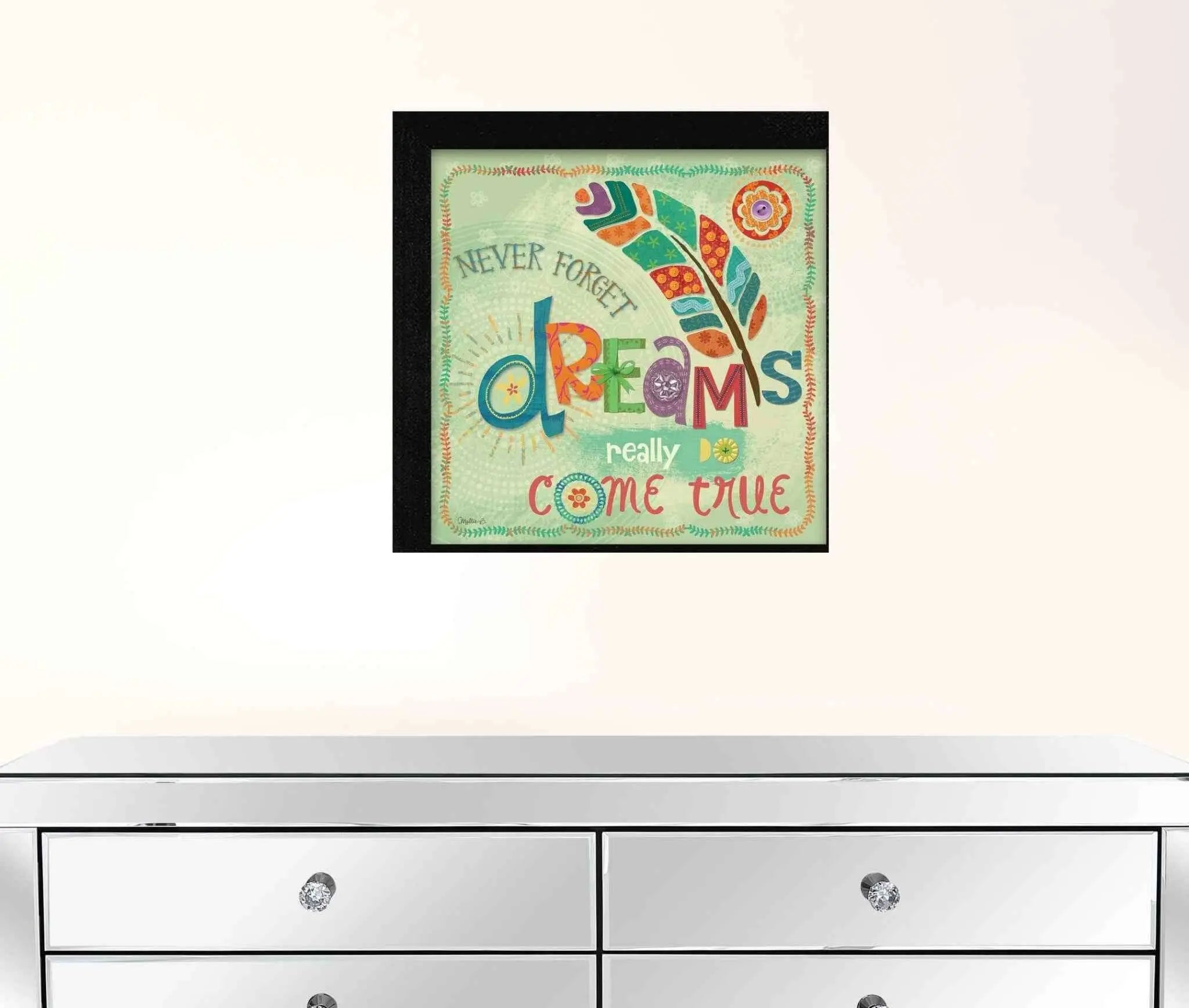 This dreams come true black framed print wall art will add a beautiful decorative accent to your decor. This print is a visual artistic expression that allows you to decorate your space in style. Reproduced for you on paper, this hanging decorative accent will be a trendy and fashionable way to dress your walls. Adding this hanging wall art to your space to make your room feel more finished and attractive. Utilize this opportunity to create a focal point in the room with this fabulous wall decor option. 14 inches H x 14 inches W x 1 inches D