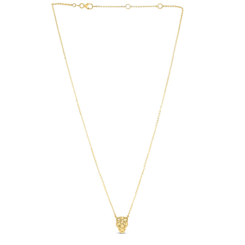 This Panther Head necklace is beautifully crafted in 14k yellow gold with a high polish finish & closes with a lobster clasp. This stunning piece is hand crafted & sits effortlessly between a glimmering diamond-cut rolo chain. Effortlessly beautiful piece to add to your collection. Pairs perfectly with the Gold Panther Stud earrings. Measuring 18 inches in length.