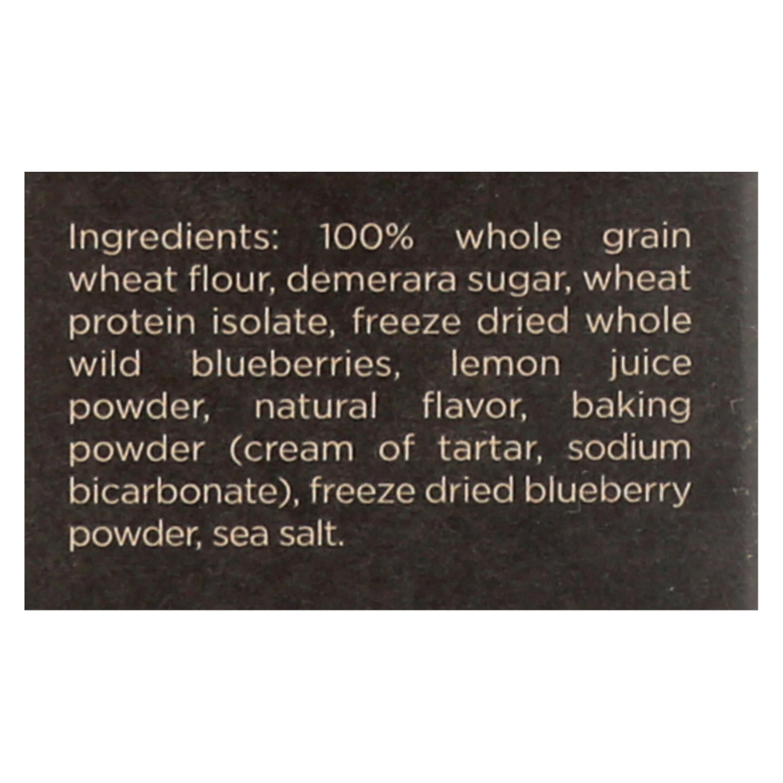 ingredients : 100% whole grain wheat flour;demerara sugar;wheat protein isolate;freeze dried whole wild blueberries;lemon juice powder;natural flavor;baking powder;cream of tartar;sodium bicarbonate;freeze dried blueberry powder;sea salt