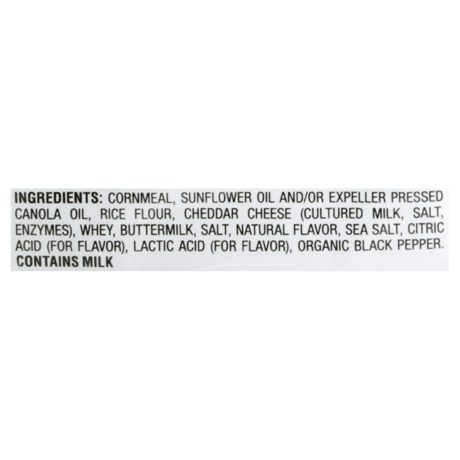 ingredients : cornmeal;sunflower oil and/or expeller pressed canola oil;rice flour;cheddar cheese (cultured milk, salt, enzymes);whey;buttermilk;salt;natural flavor;sea salt;citric acid (for flavor);lactic acid (for flavor);organic black pepper