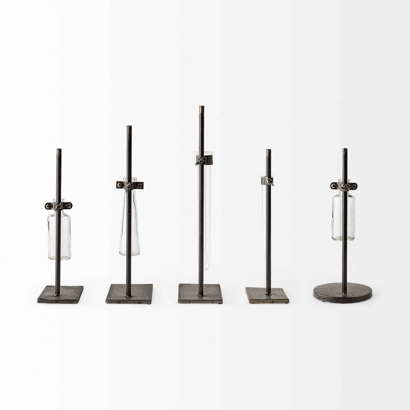 This Set of Five Test Tube Vases with Metal Bases is the perfect way to add a unique design touch to the decor in your home. There are five pieces in this set all with different sizes and shapes of test tubes. The bases of these vases are made from metal with four of them having square bases and one with a round base. From each of the base there is a metal rod that comes up and has a bracket in the middle of it. Attached to the bracket there are two narrow test tubes, two bottle shapes test tubes, and one triangular shaped test tube. You can use this set to display flowers or you can use it as a decor piece. Break it up or use it all in the same place, the choice is yours. 13" H x 5" W x 5" D