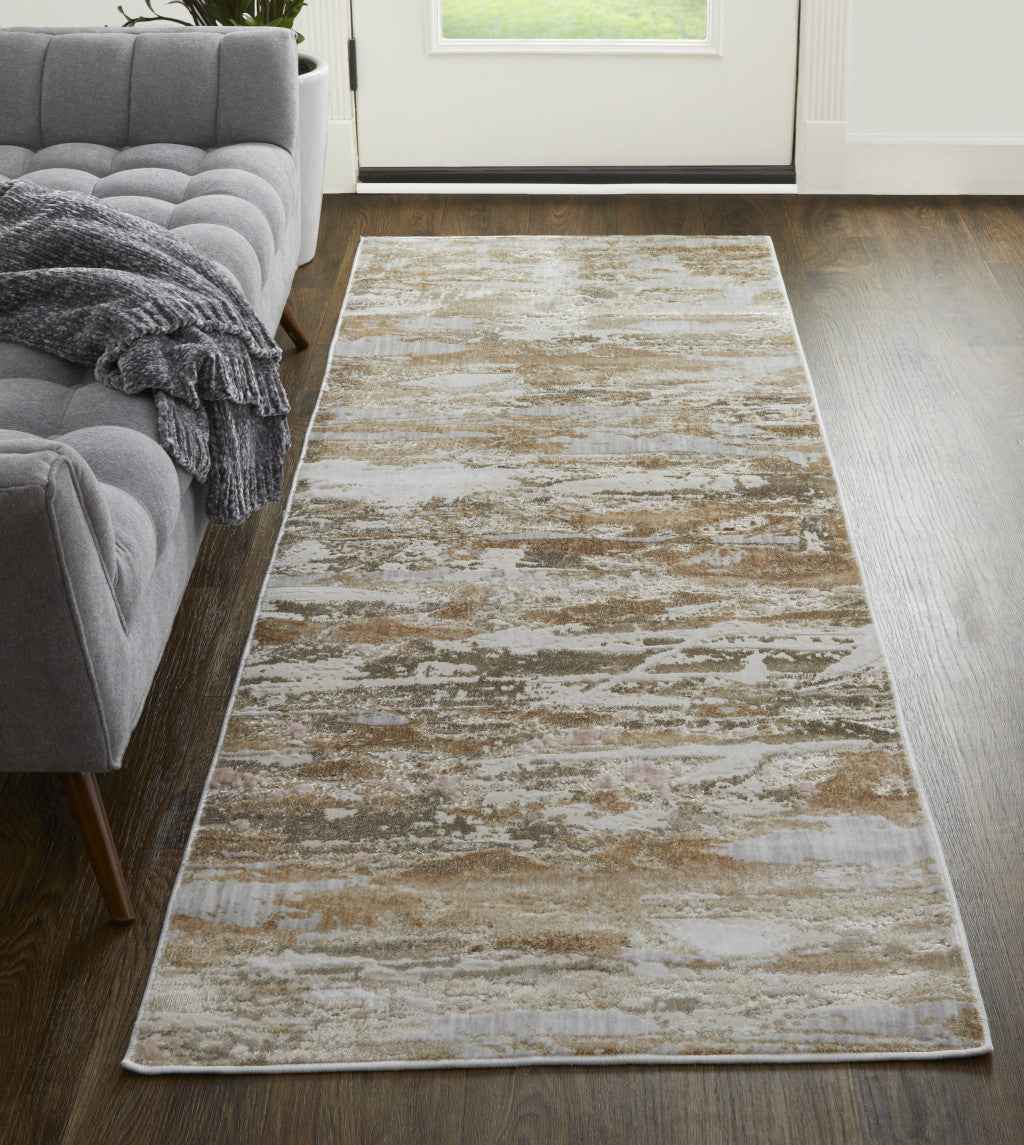 10' Beige and Ivory Abstract Power Loom Distressed Runner Rug