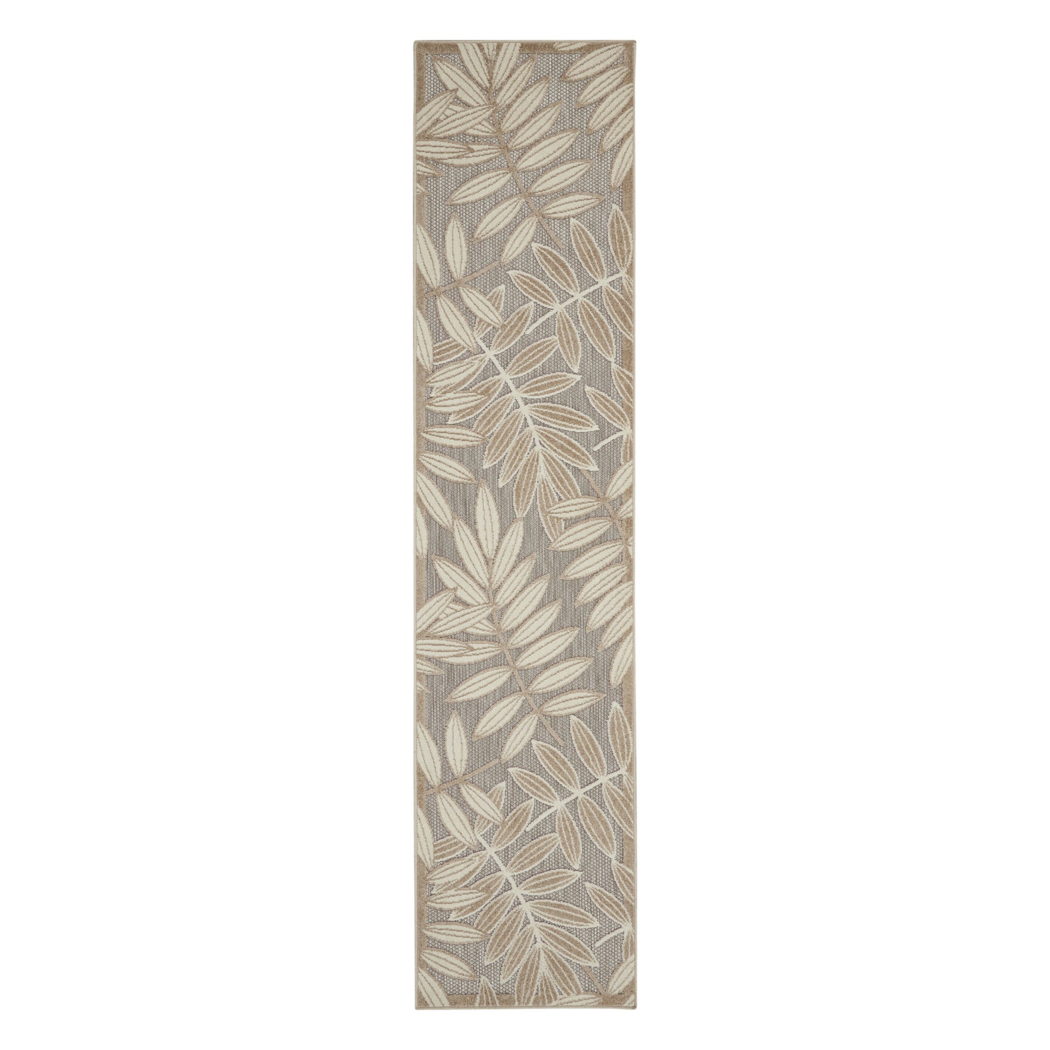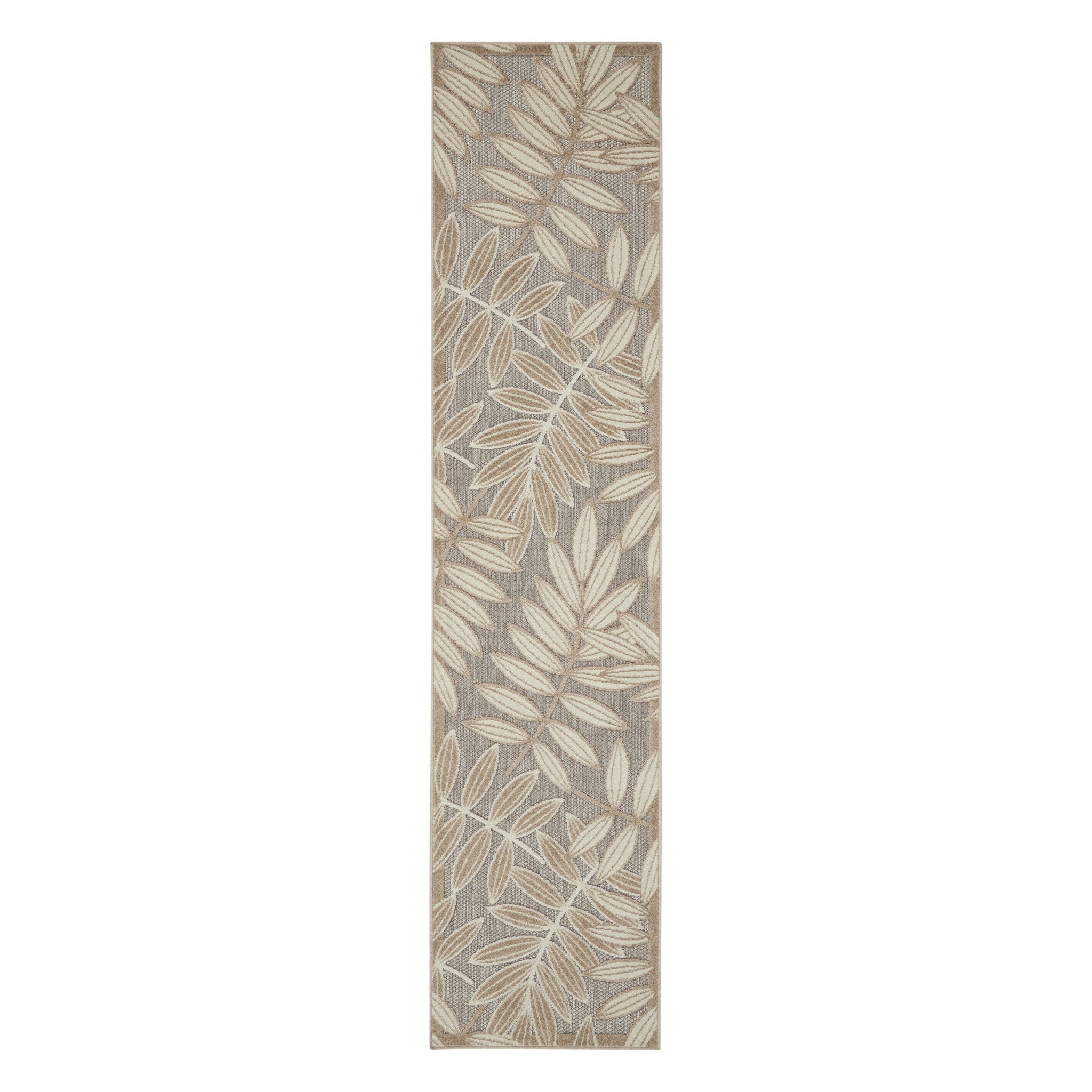 Set an inviting tone in your space with this 10-foot beige gray and ivory botanical leaves indoor outdoor runner rug. This runner shaped rug features a botanical leaves design that will work well both indoors or out. A classic shape marries with good looking design for your living room, hall, bedroom, porch, patio, or poolside. Ideal for outdoor spaces or high traffic areas with kids and pets, this rug is made from heavy duty polypropylene that is stain resistant to help repel water, dirt, and stains. Makes a great way to dress up your patio, porch, or poolside, but also works well as a durable and easy to maintain option in the kitchen, family room, or mudroom. 27-inch h x 120-inch w x 1-inch d.