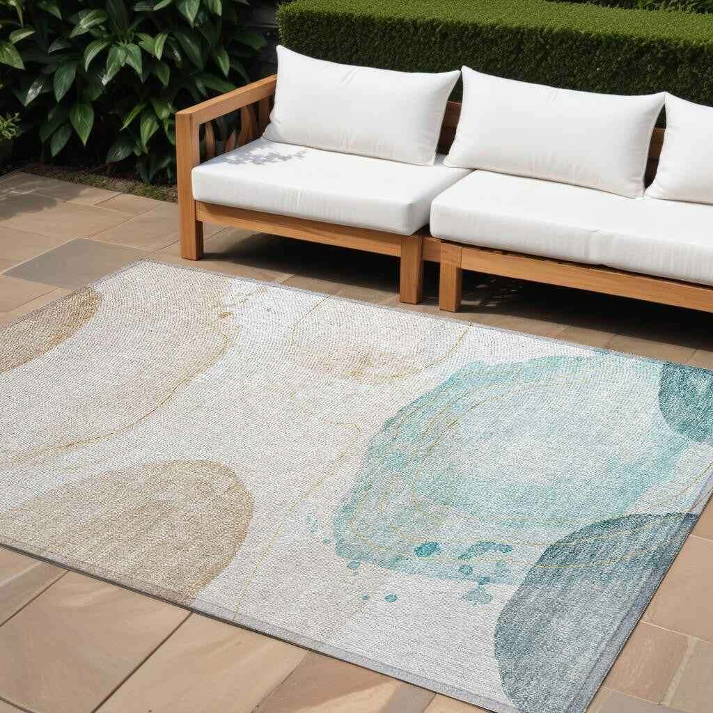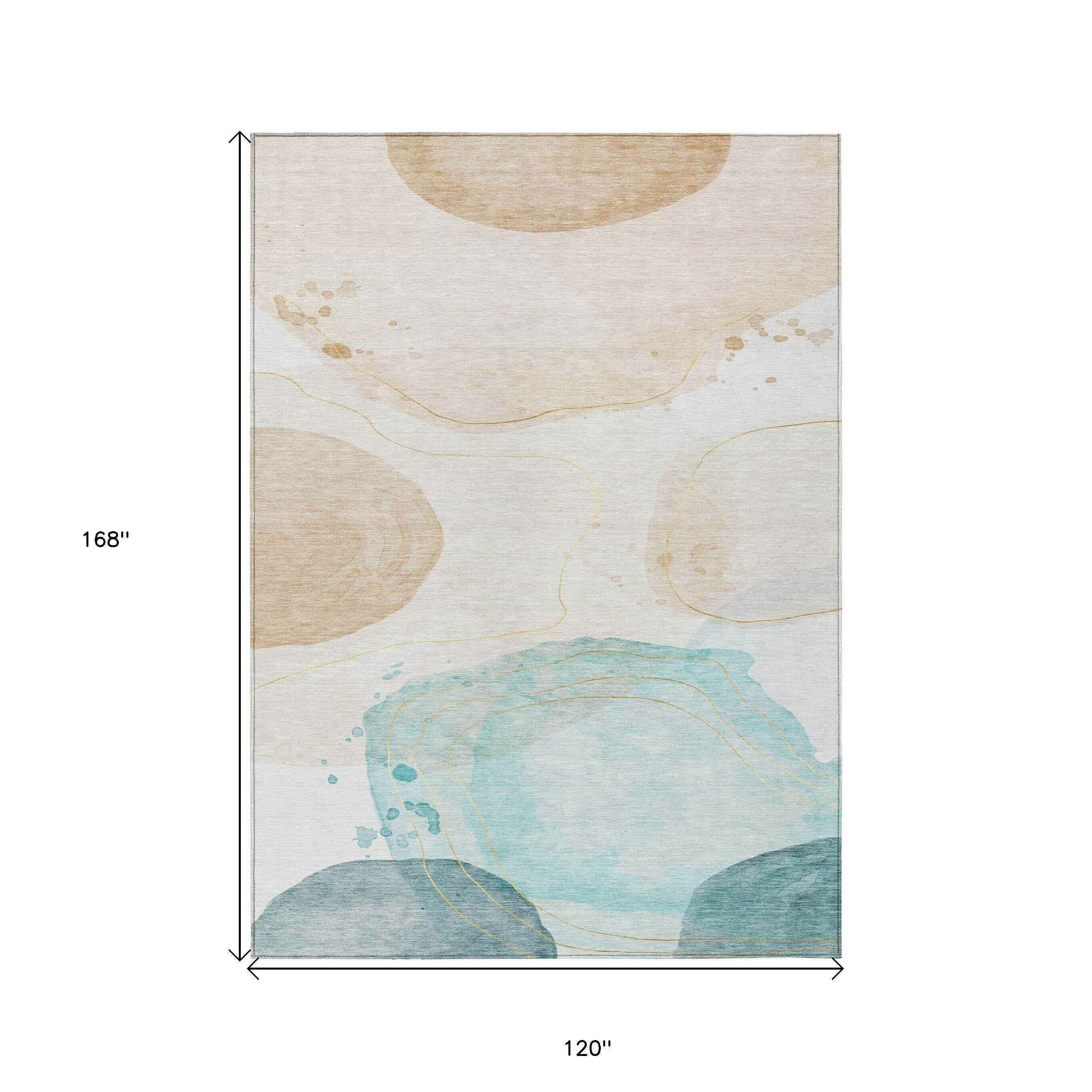 10' X 14' Beige and Blue Abstract Washable Non Skid Indoor Outdoor Area Rug