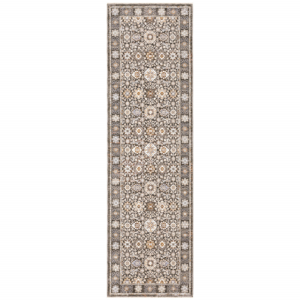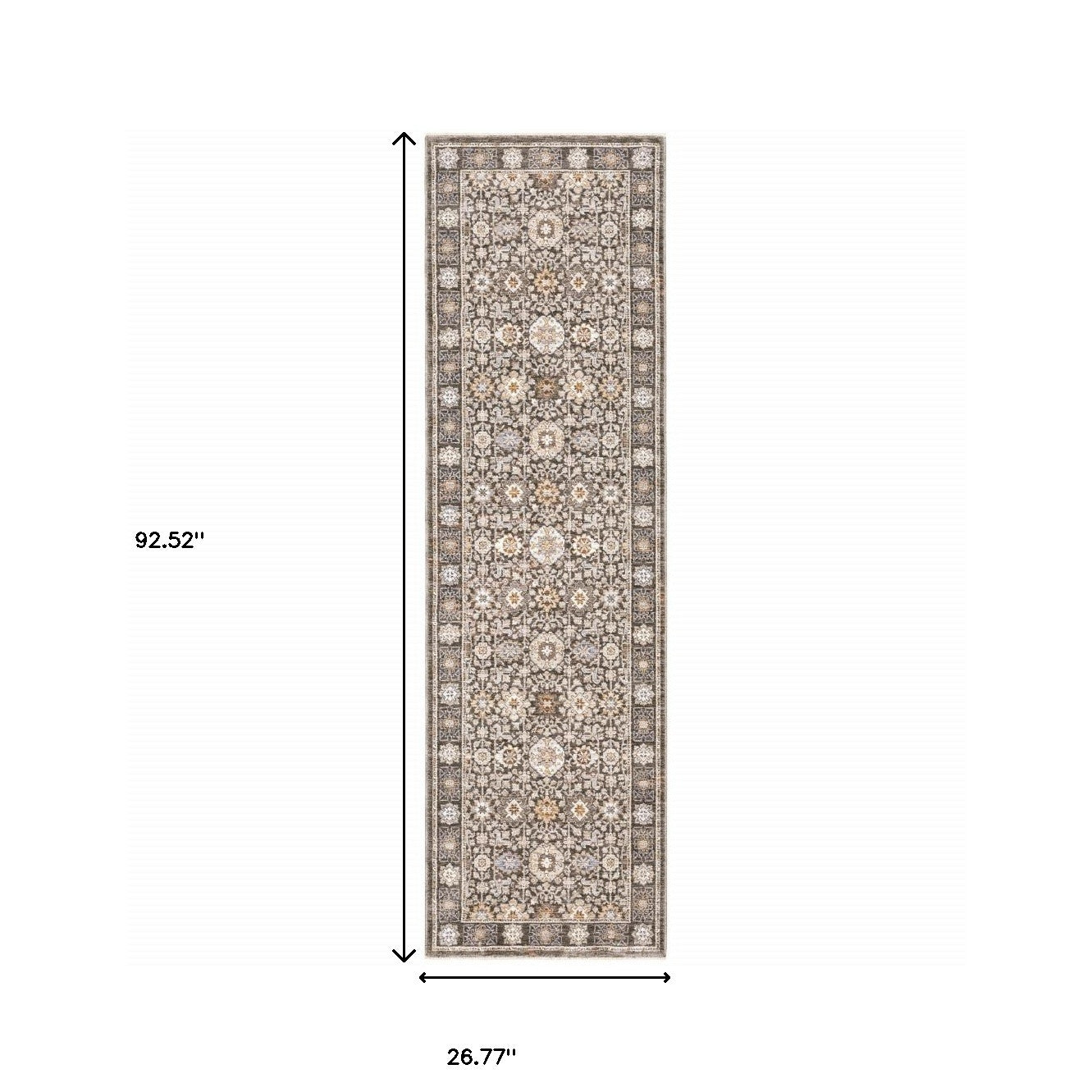 2' X 8' Grey And Ivory Oriental Power Loom Stain Resistant Runner Rug With Fringe