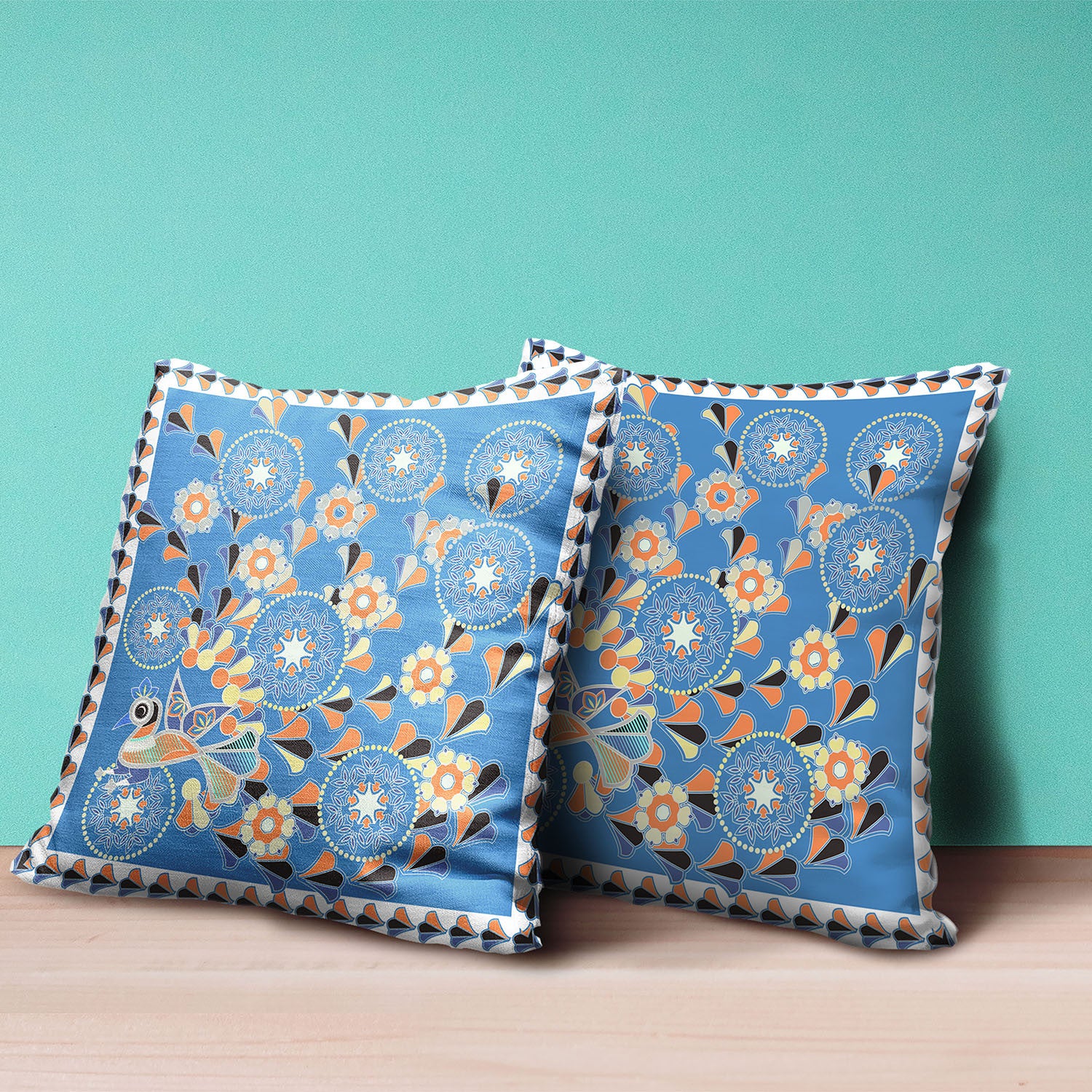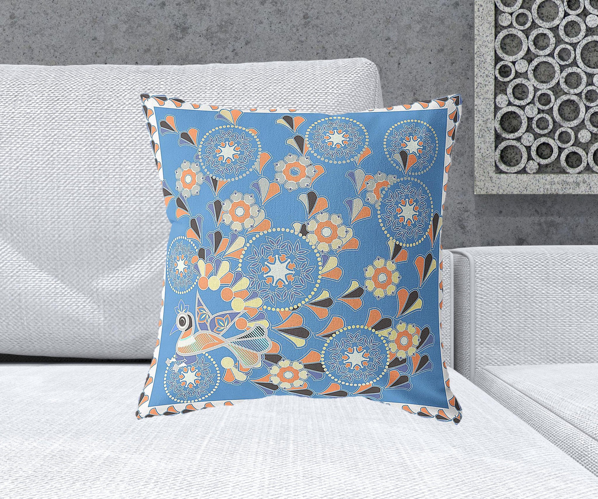 20" x 20" Blue and Orange Peacock Blown Seam Floral Indoor Outdoor Throw Pillow