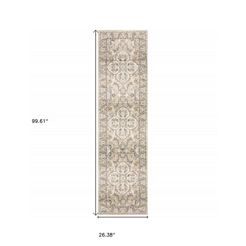 The traditional charm of this Beige and Ivory Medallion Runner Rug will transform your living space with a timeless style signifying class and comfort. The ivory backdrop is intricately designed with beige and gray eclectic accents flaunting a floral medallion in the center. It is made in the United States with machine-woven nylon and polypropylene mix and the cut-pile construction adds to its surface interest. Roll this neutral-toned runner rug on the floor and it will seamlessly blend in with any interior theme upholding an airy ambiance to your space. 1” x 26.38” x 99.61”