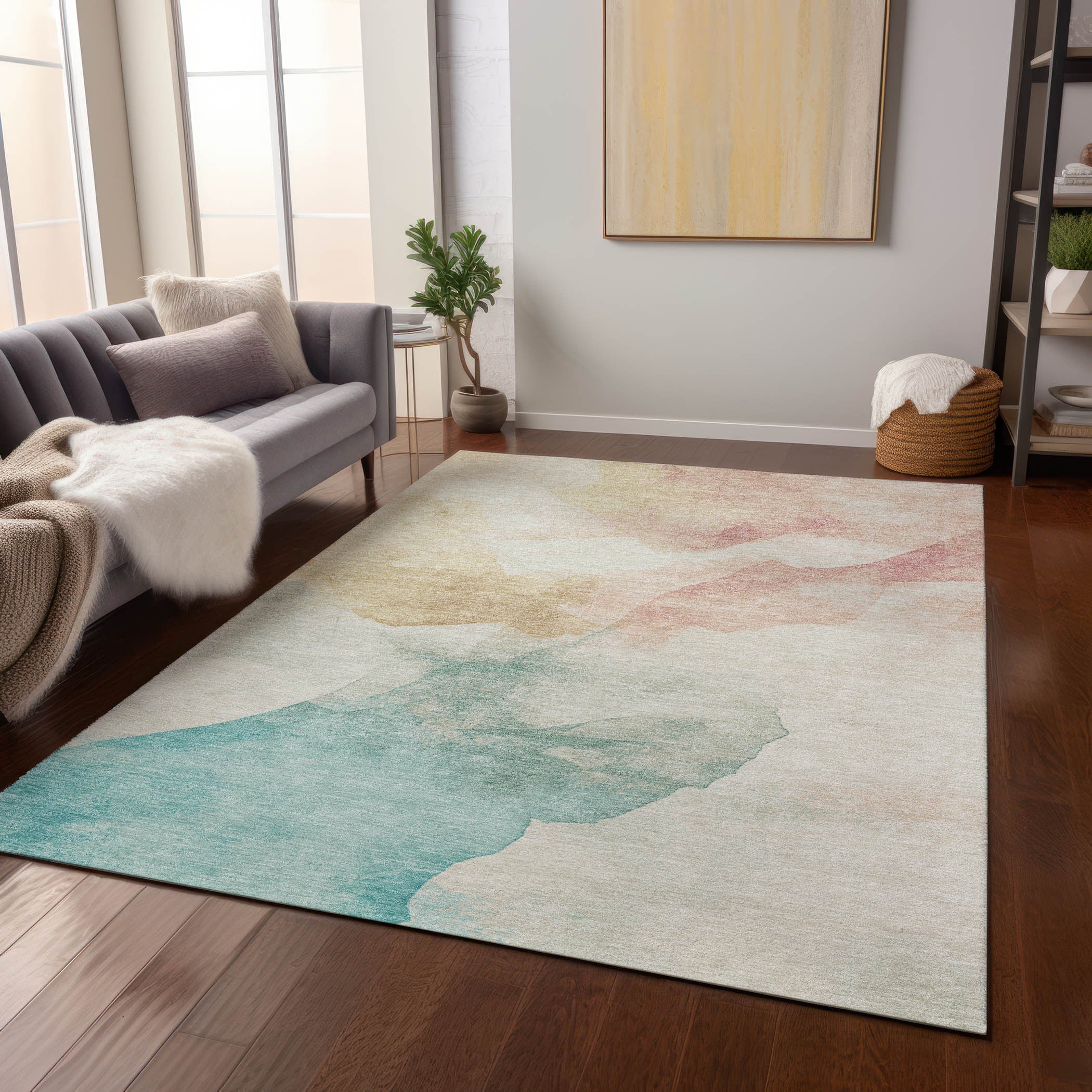 3' X 5' Pearl Ivory Beige And Teal Blue Abstract Washable Indoor Outdoor Area Rug