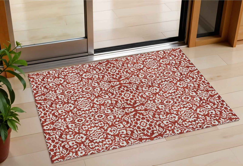 3' X 5' Red And Ivory Damask Washable Indoor Outdoor Area Rug